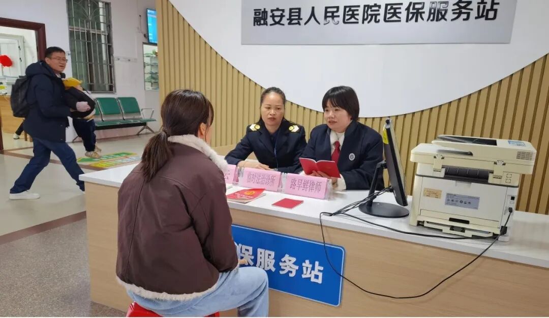 3月2日,在融安县人民医院,县卫健局工作人员与广西至和(融安)律师事务所的律师,共同为因意外车祸寻求帮助的群众提供法律咨询。