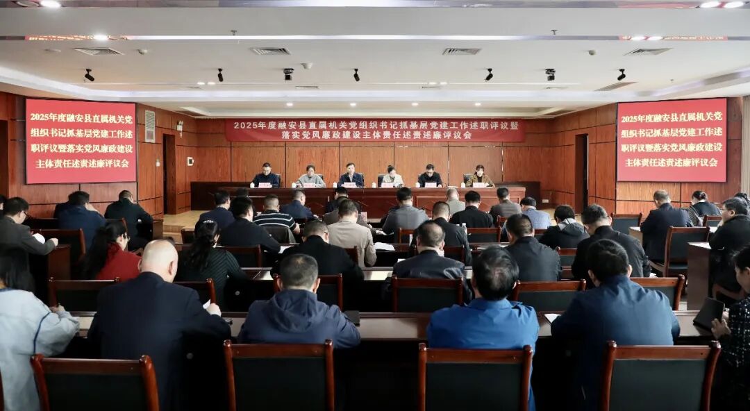 3月30日,在县商务中心主楼13楼大会议室拍摄的2025年度融安县直属机关党组织书记抓基层党建工作述职评议暨落实党风廉政建设主体责任述责述廉评议会现场。(方淑敏 摄)