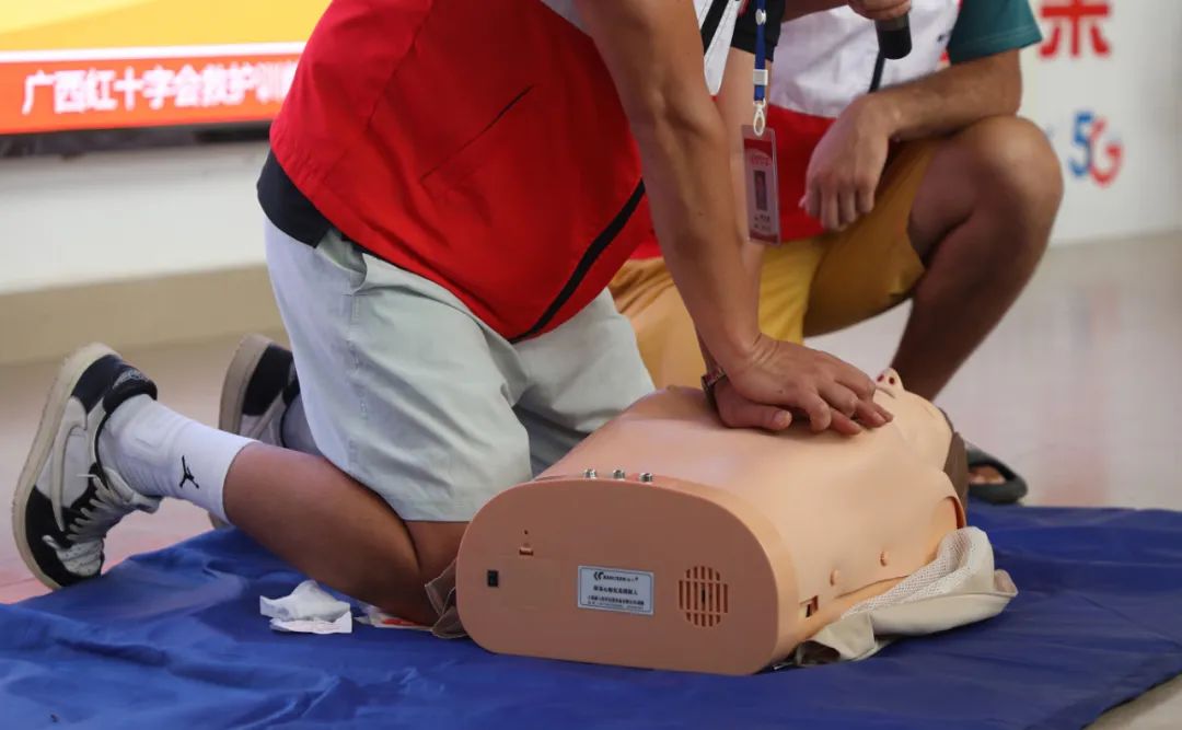 本次培训采取理论讲解、现场演示等形式,宣传培训内容包括防溺水知识、心肺复苏演示等。在活动现场,融安县红十字志愿者向群众讲解了往年溺水事故带来的深刻教训,介绍学习防溺水安全知识的重要性,以及如何自护、自救、急救、求助等常识,利用人体模型对徒手心肺复苏的全过程进行讲解示范。