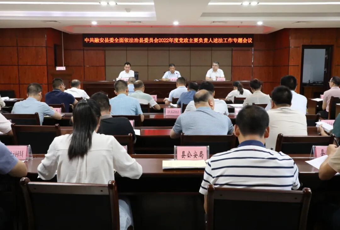 8月3日,中共融安县委全面依法治县委员会2022年度党政主要负责人述法工作专题会议召开,会议传达学习上级会议精神,听取各乡镇和有关单位党政主要负责人述法,研究部署下一步全面依法治县工作。