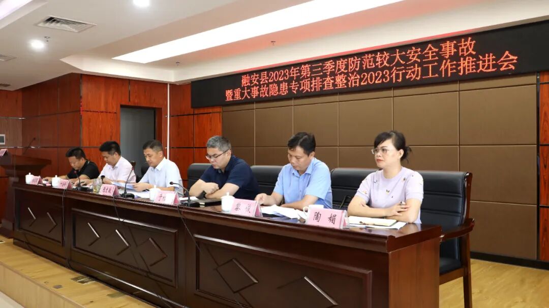 8月4日,融安县2023年第三季度防范较大安全事故暨重大事故隐患专项排查整治2023行动工作推进会在县商务中心主楼13楼会议室召开,认真贯彻落实自治区、柳州市的决策部署,布置全县第三季度安全生产工作任务,推进全县重大事故隐患专项排查整治2023行动,确保全县安全形势持续稳定向好。县委书记陈文敏作强调讲话,县委副书记、县长于福坚作安全生产工作部署,县委常委、副县长叶海峰主持会议。