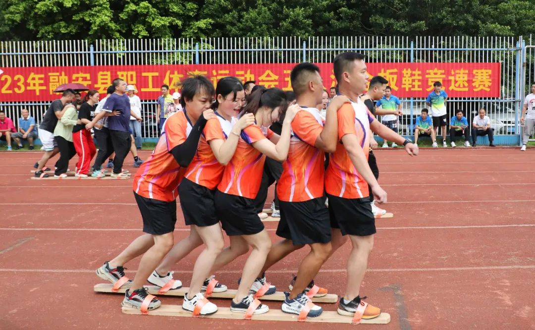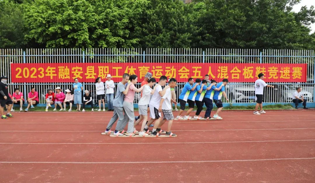 8月11日,2023年融安县职工体育运动会五人混合板鞋竞速赛在县文体中心举行,来自各乡(镇)、县直部门、企事业单位共21支队伍参加该项比赛。