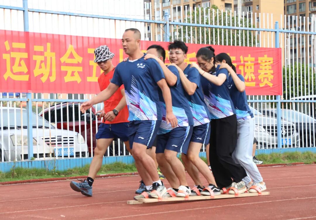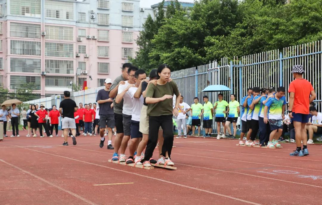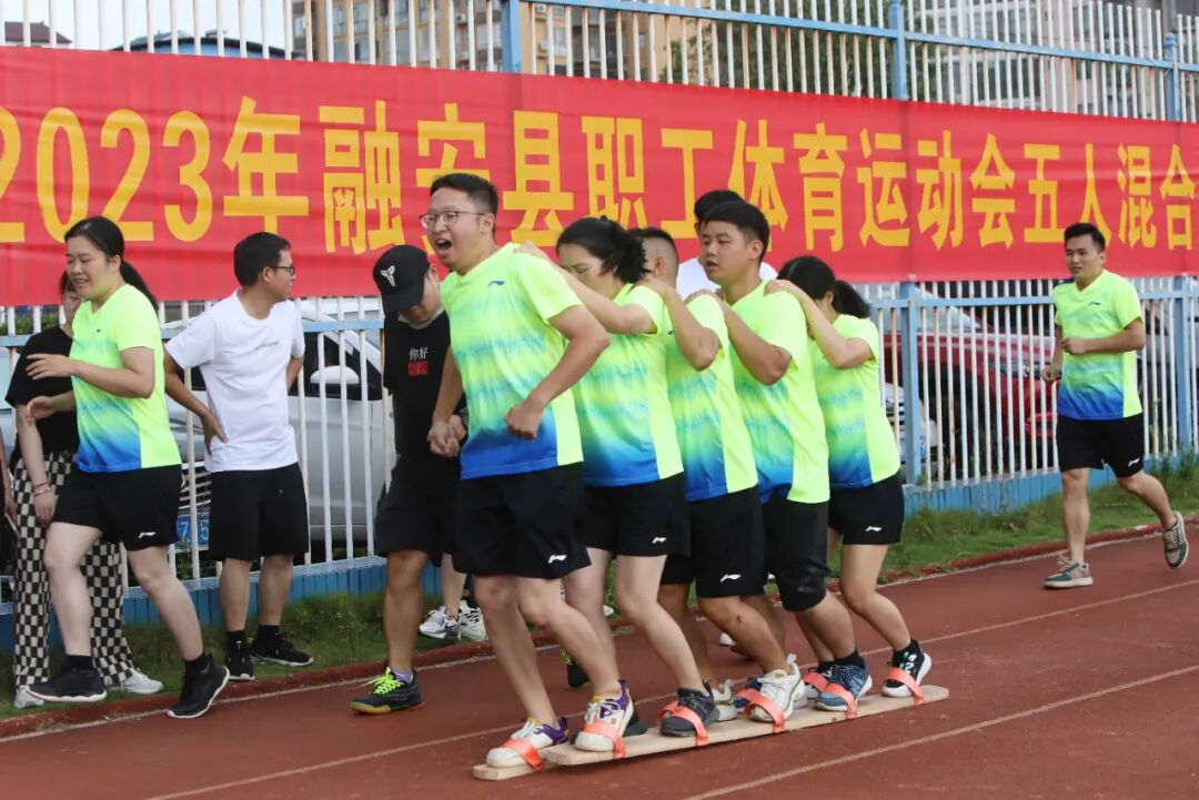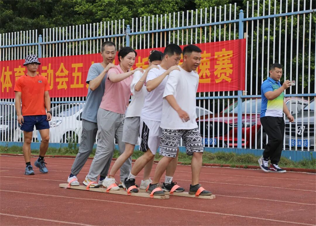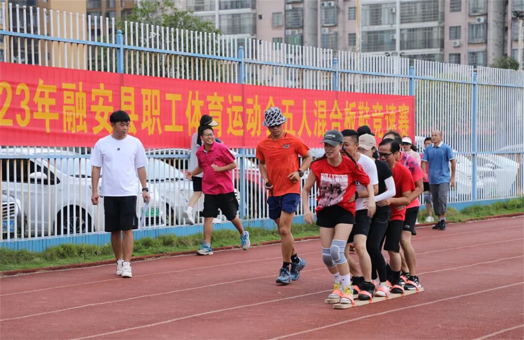 8月11日,在县文体中心拍摄的2023年融安县职工体育运动会五人混合板鞋竞速赛现场。(尹楚皓 摄)