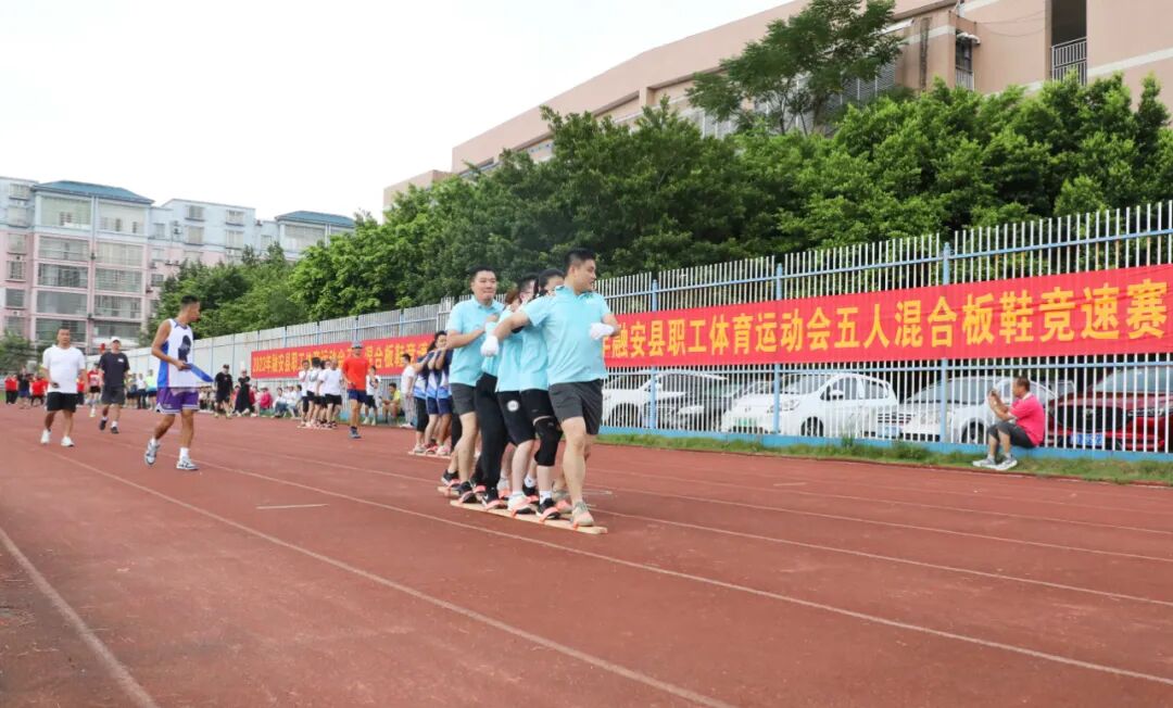 8月11日,在县文体中心拍摄的2023年融安县职工体育运动会五人混合板鞋竞速赛现场。(杨曼 摄)