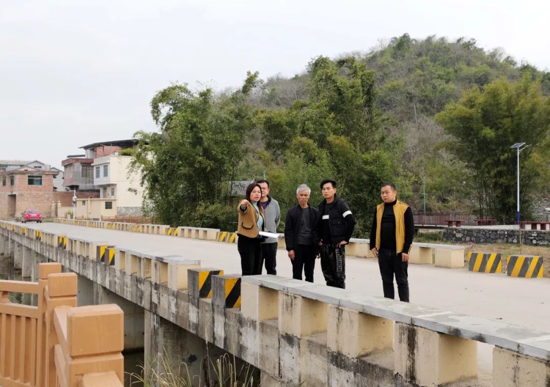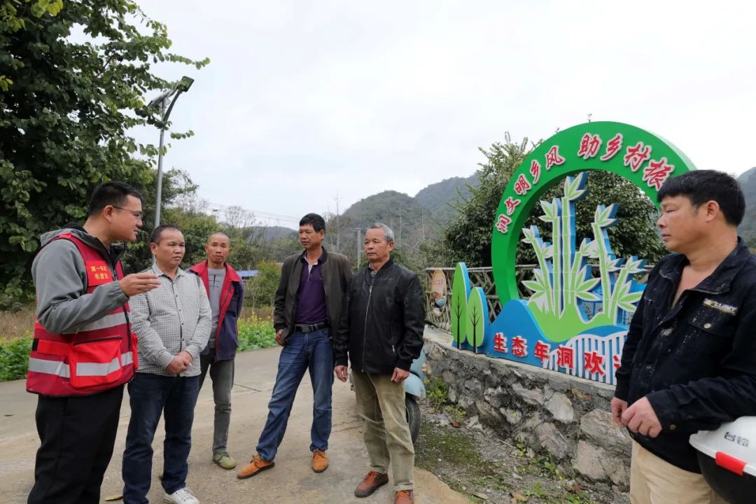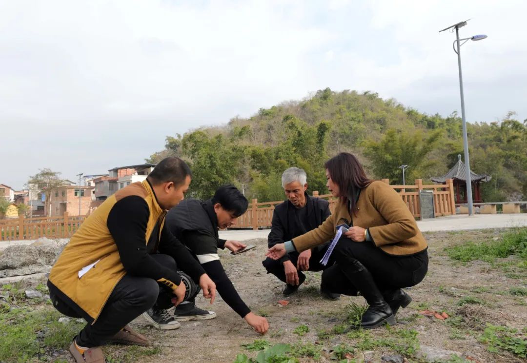 1月18日,融安县大良镇古兰村,村支书覃彩榴与村民实地勘察地埋式垃圾桶选址点。(韦荣军 摄)