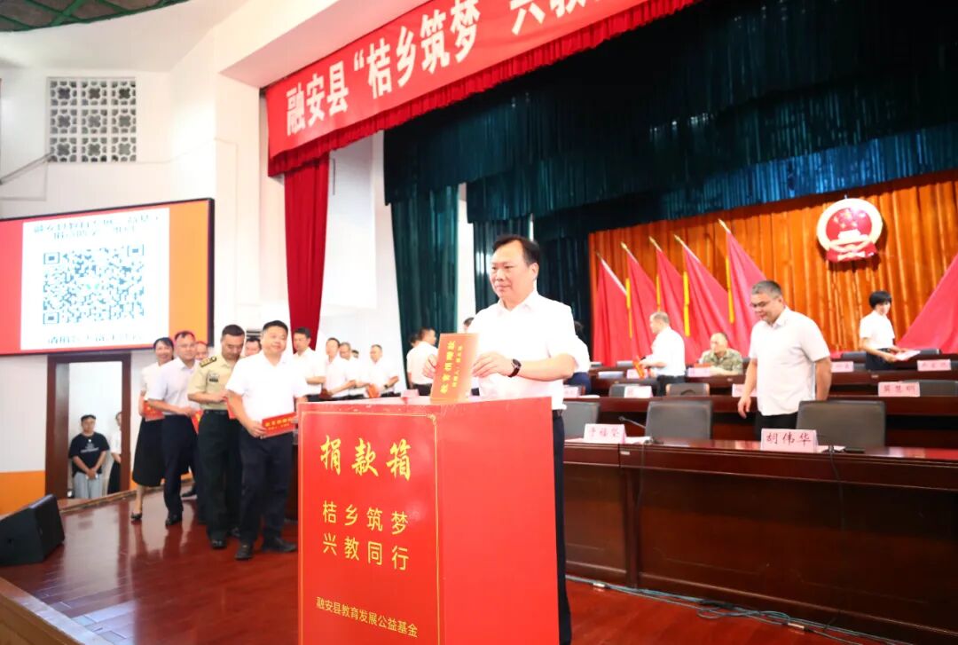 8月29日,融安县“桔乡筑梦 兴教同行”教育发展公益基金捐赠仪式在县人民会场举行,县委书记于福坚,县委副书记、县长胡伟华、县人大常委会主任肖素清、县政协主席梁太福等县四家班子领导参加捐赠仪式,并带头捐资,号召全县广大干部群众共同为全县教育事业发展贡献力量。