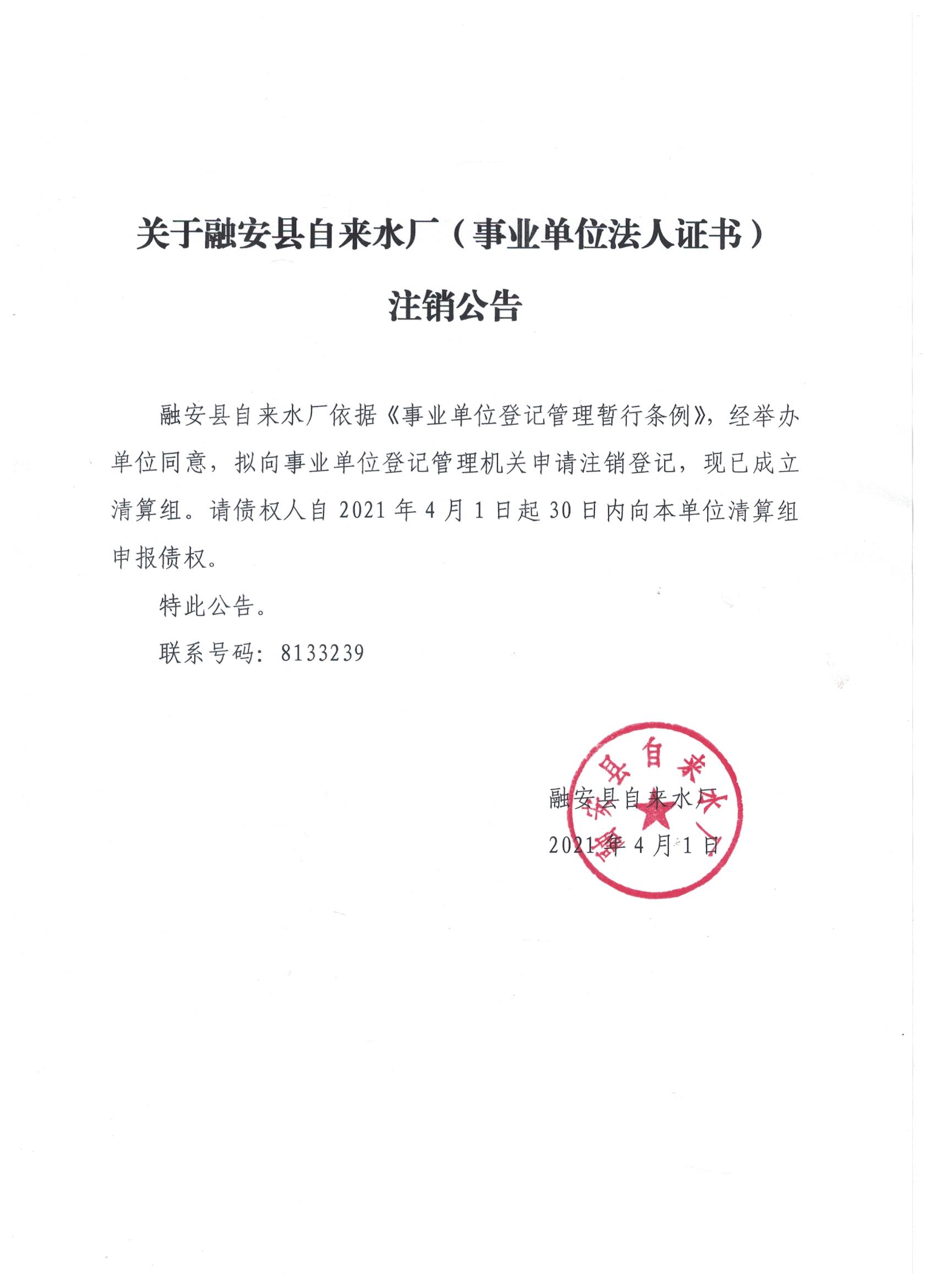 关于融安县自来水厂(事业单位法人证书)第二次注销公告