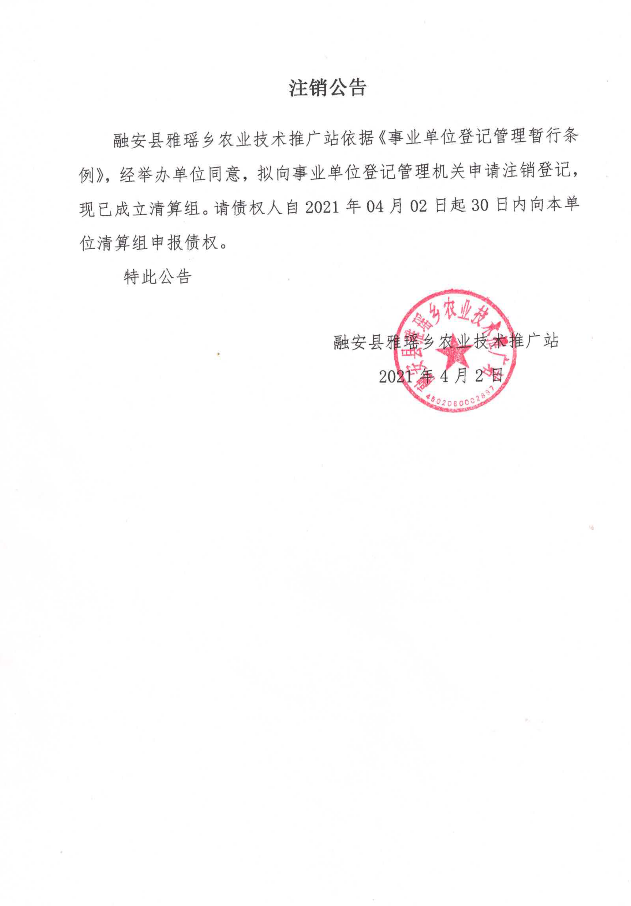 融安县雅瑶乡农业技术推广站第二次注销公告