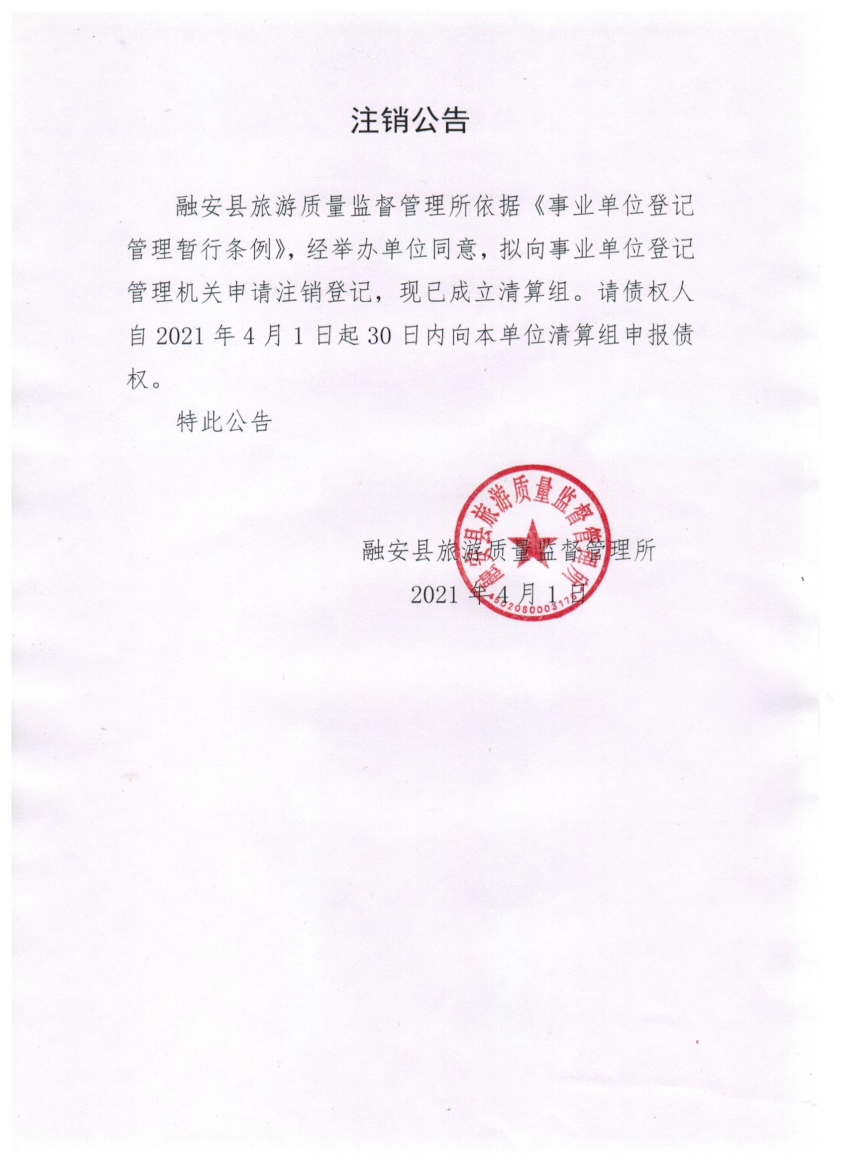 融安县旅游质量监督管理所第二次注销公告