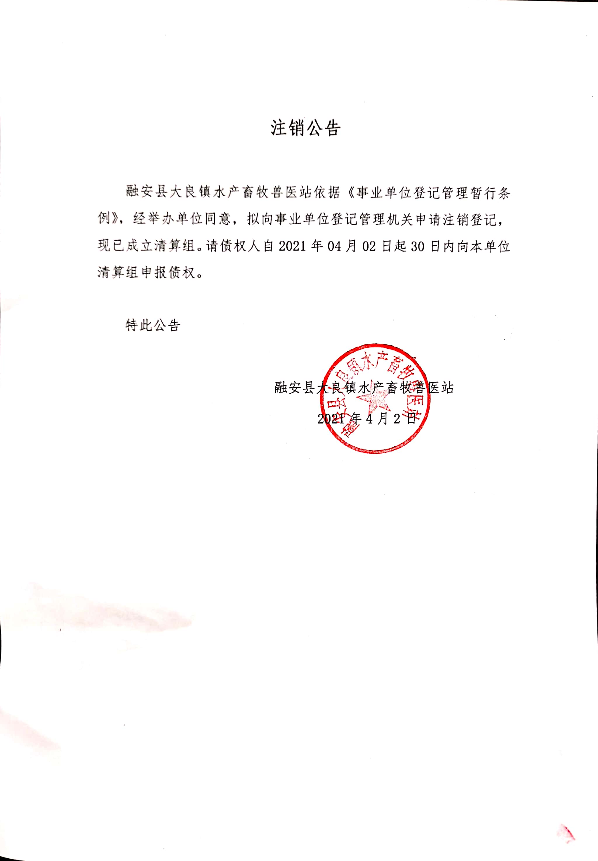 关于融安县大良镇水产畜牧兽医站第二次注销公告