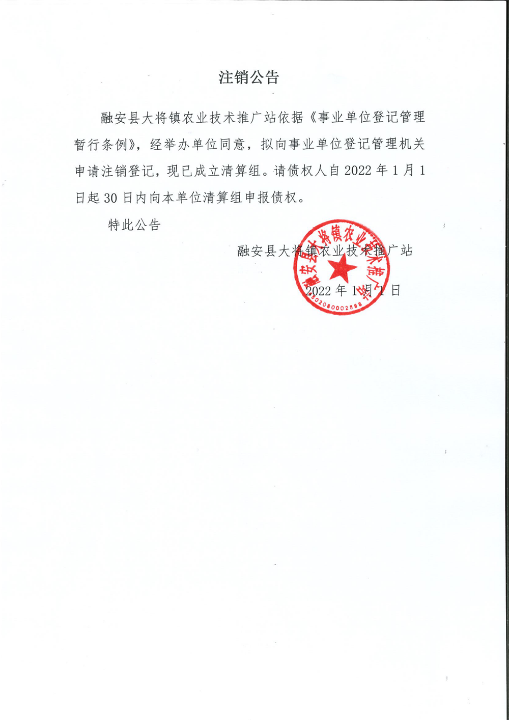 融安县大将镇农业技术推广站第三次注销公告