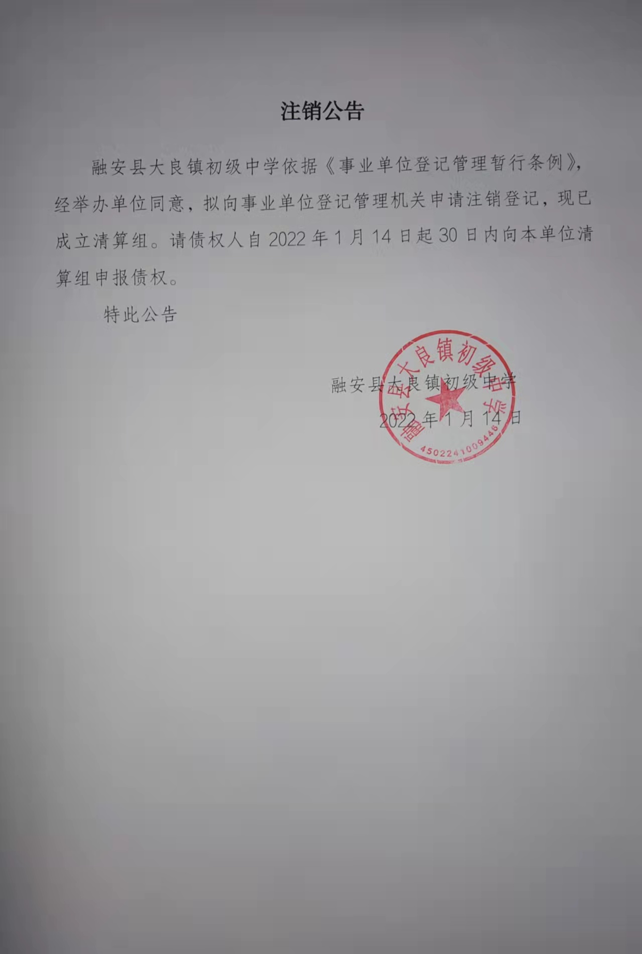 融安县大良镇初级中学第二次注销公告