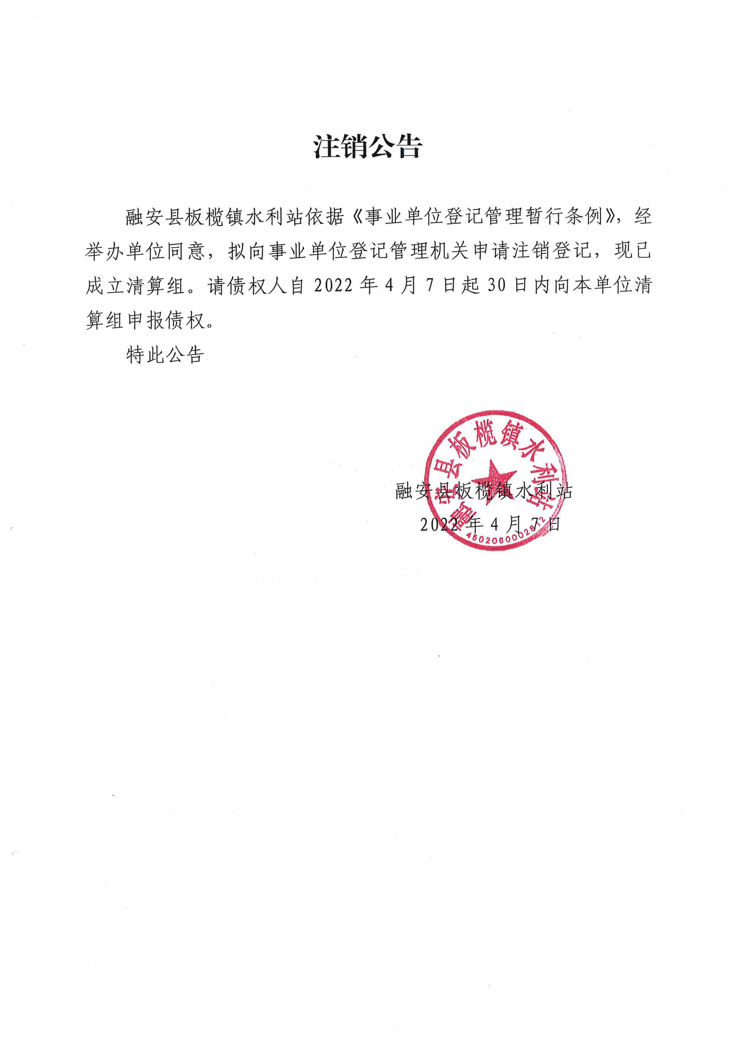 融安县板榄镇水利站第一次注销公告