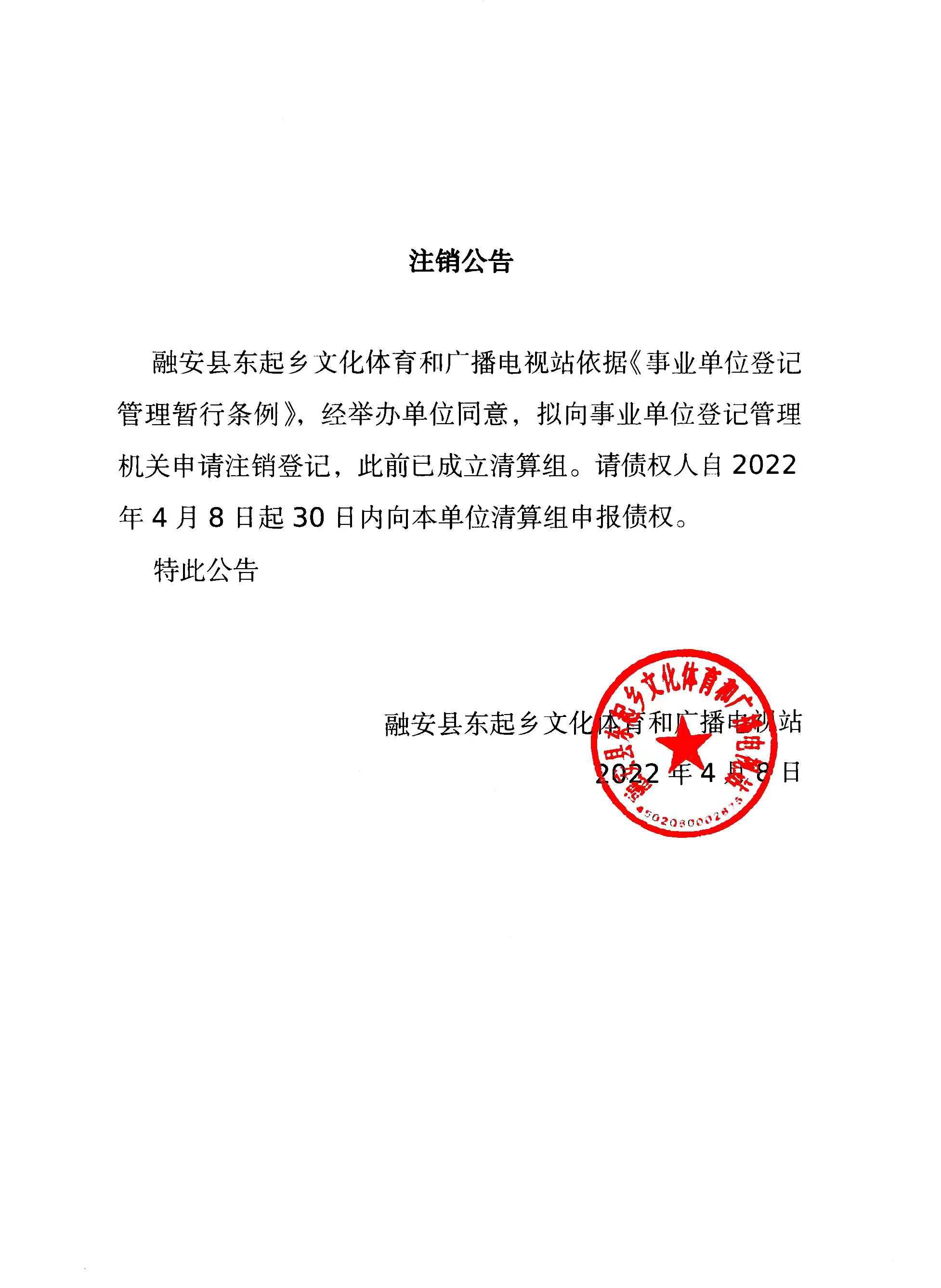 融安县东起乡文化体育和广播电视站第二次注销公告