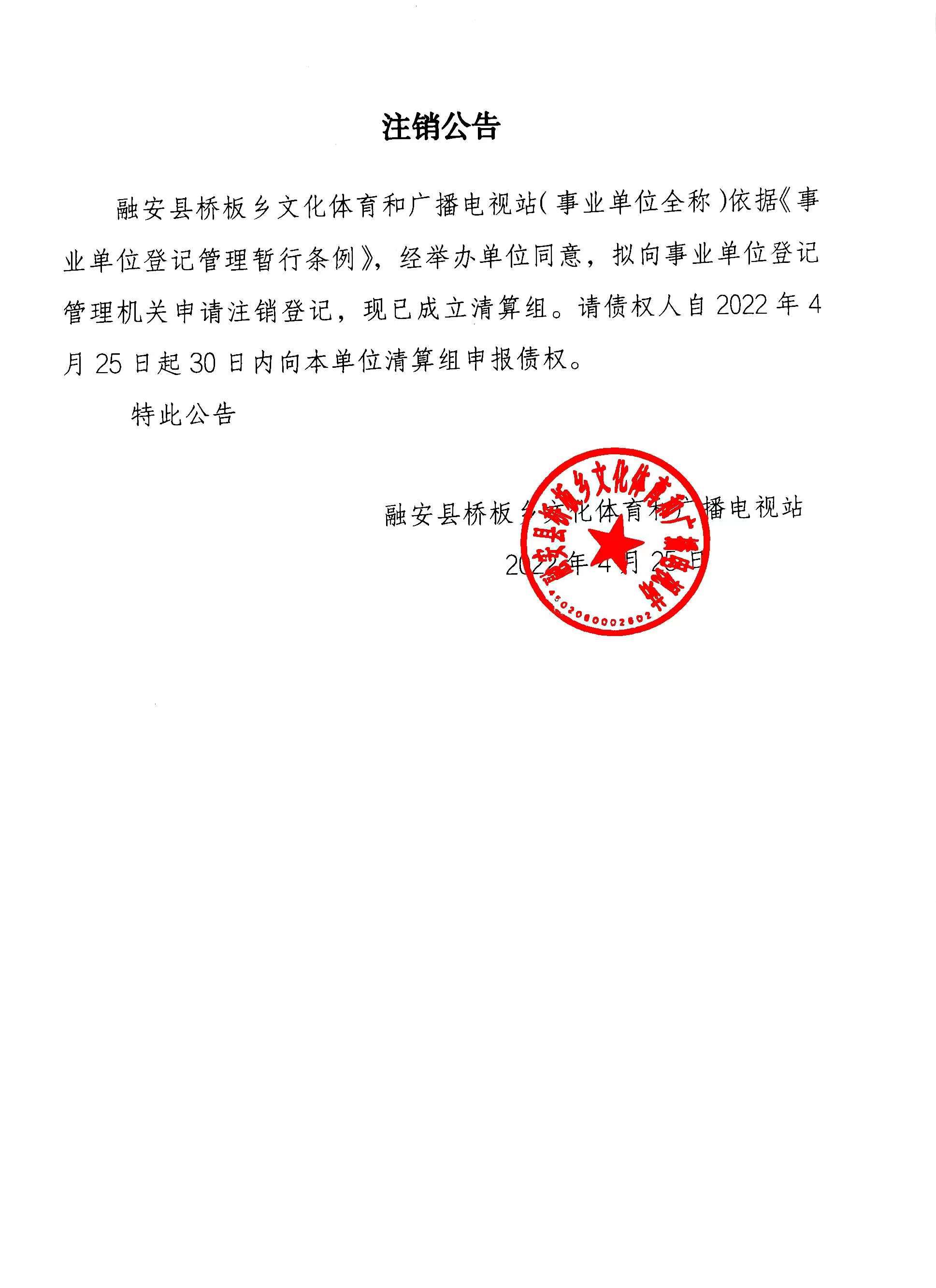 融安县桥板乡文化体育和广播电视站第二次注销公告