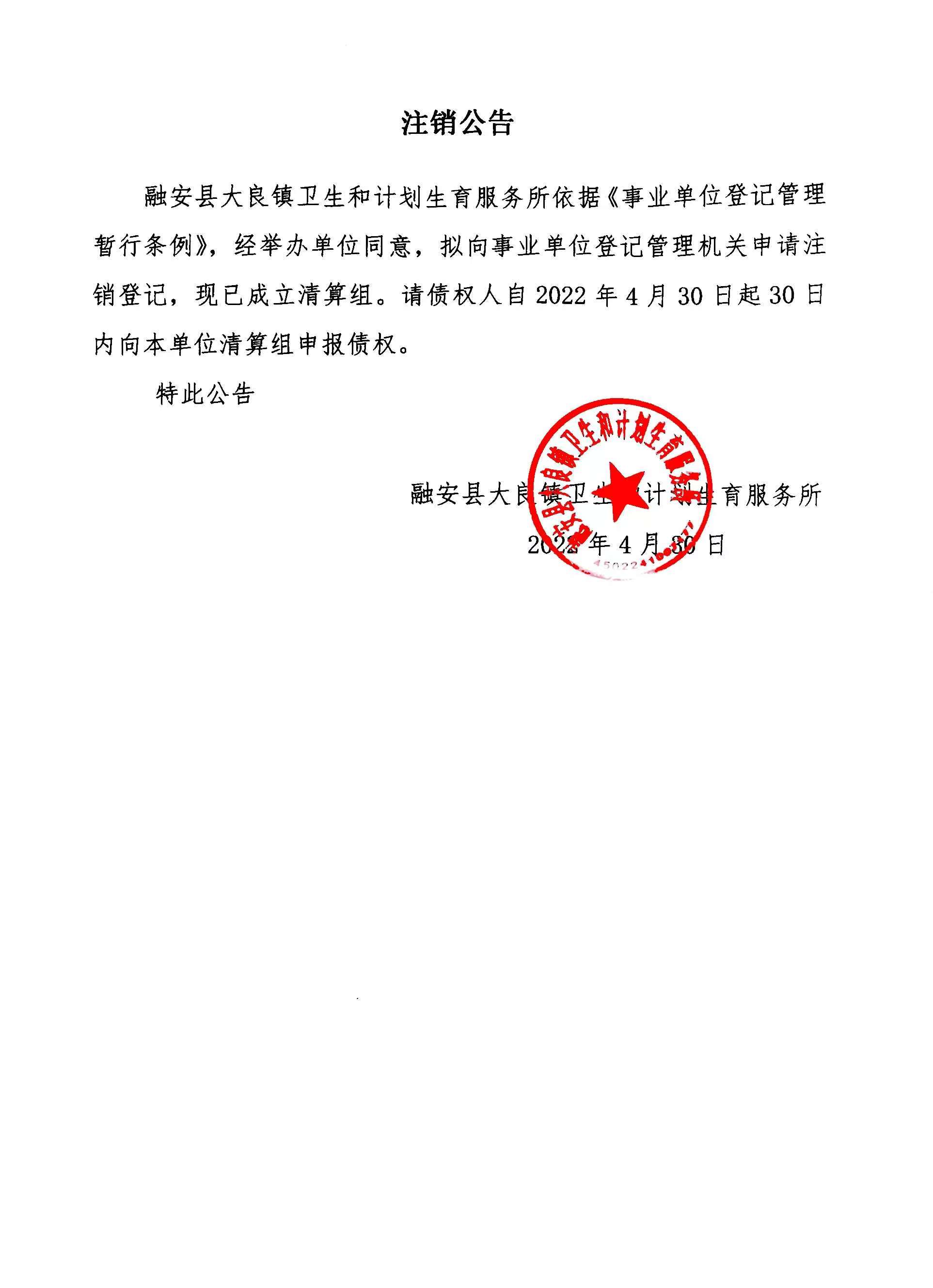融安县大良镇卫生和计划生育服务所第二次注销公告