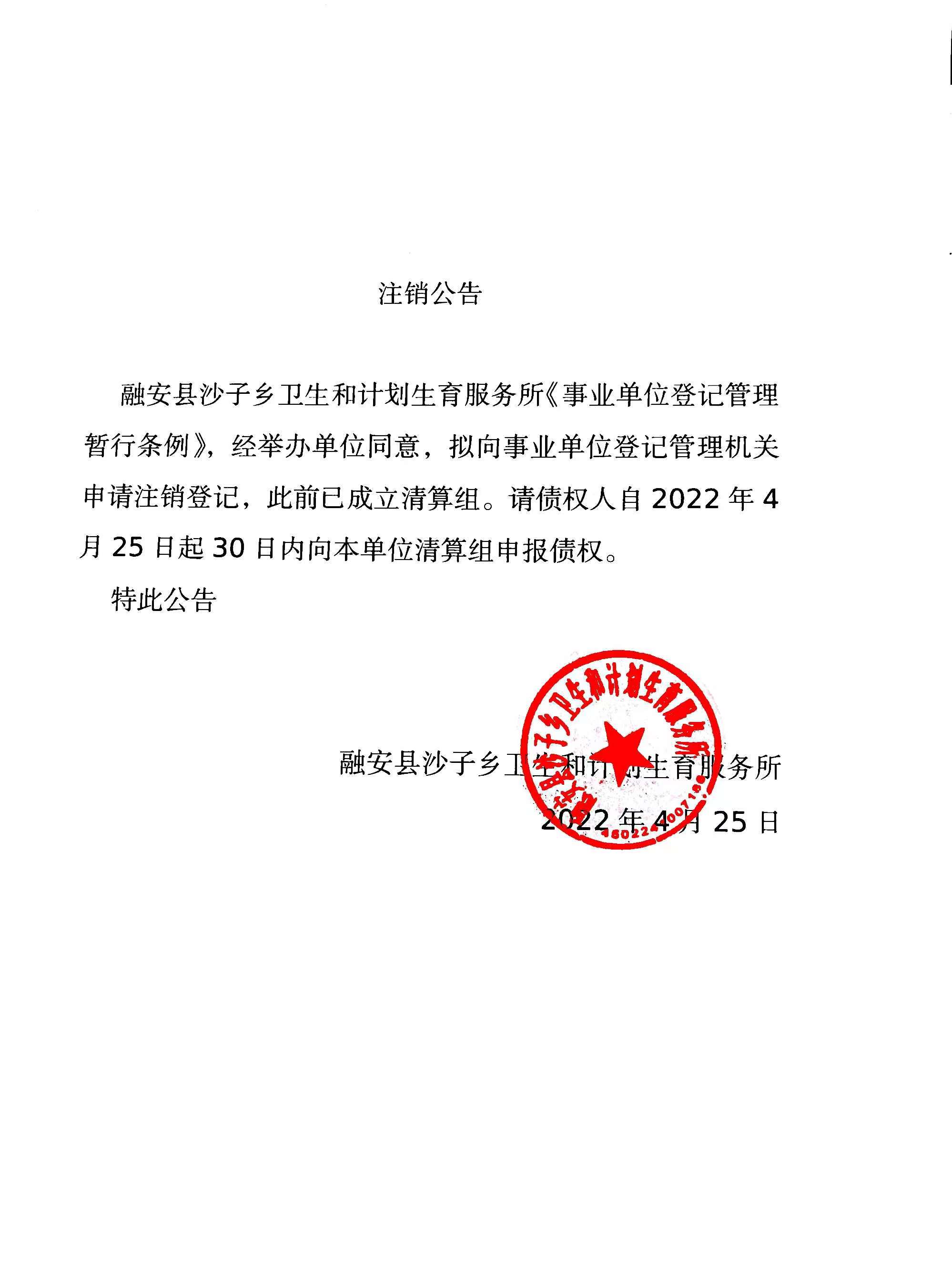 融安县沙子乡卫生和计划生育服务所第三次注销公告