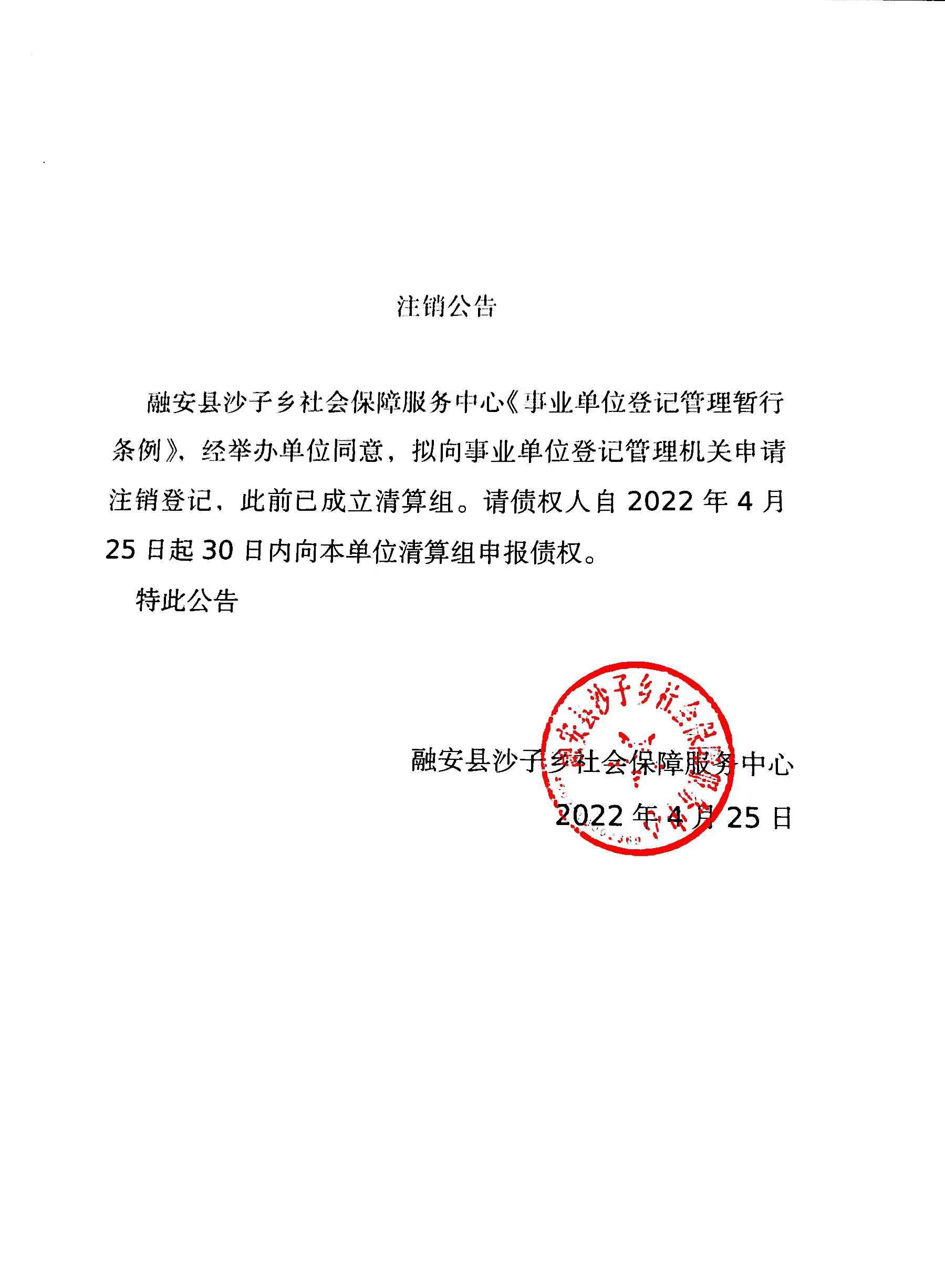 融安县沙子乡社会保障服务中心第三次注销公告
