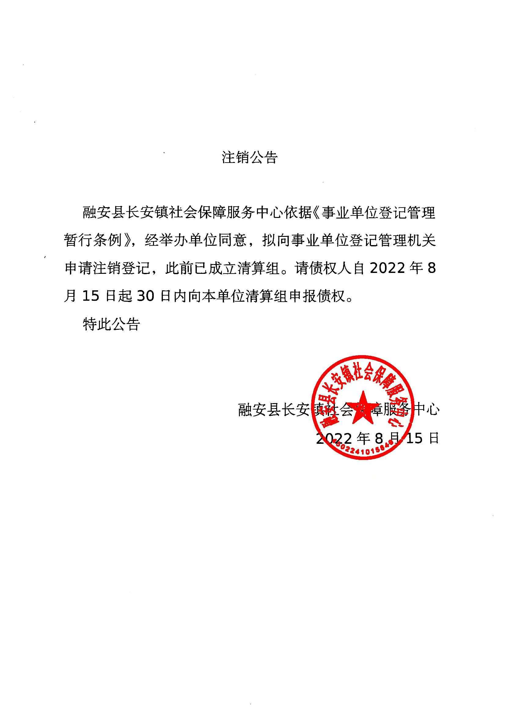 融安县长安镇社会保障服务中心第二次注销公告