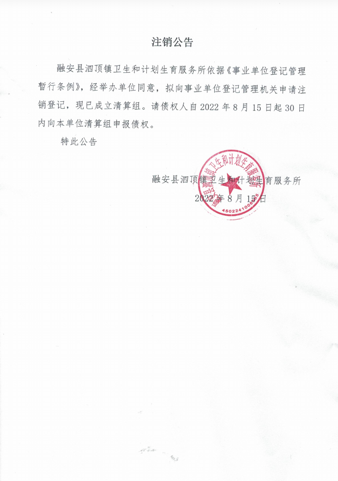 融安县泗顶镇卫生和计划生育服务所第二次注销公告