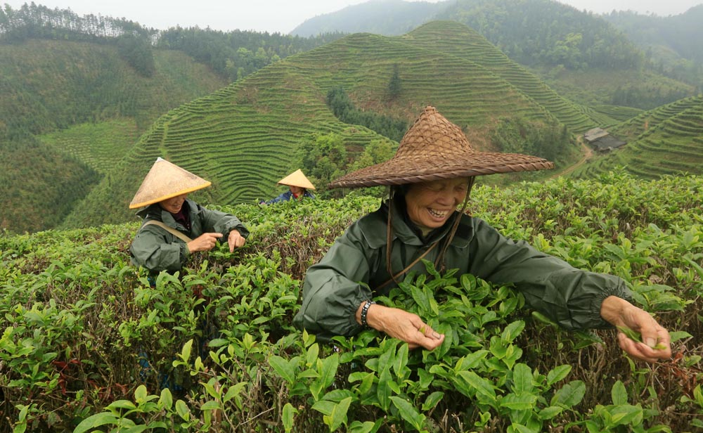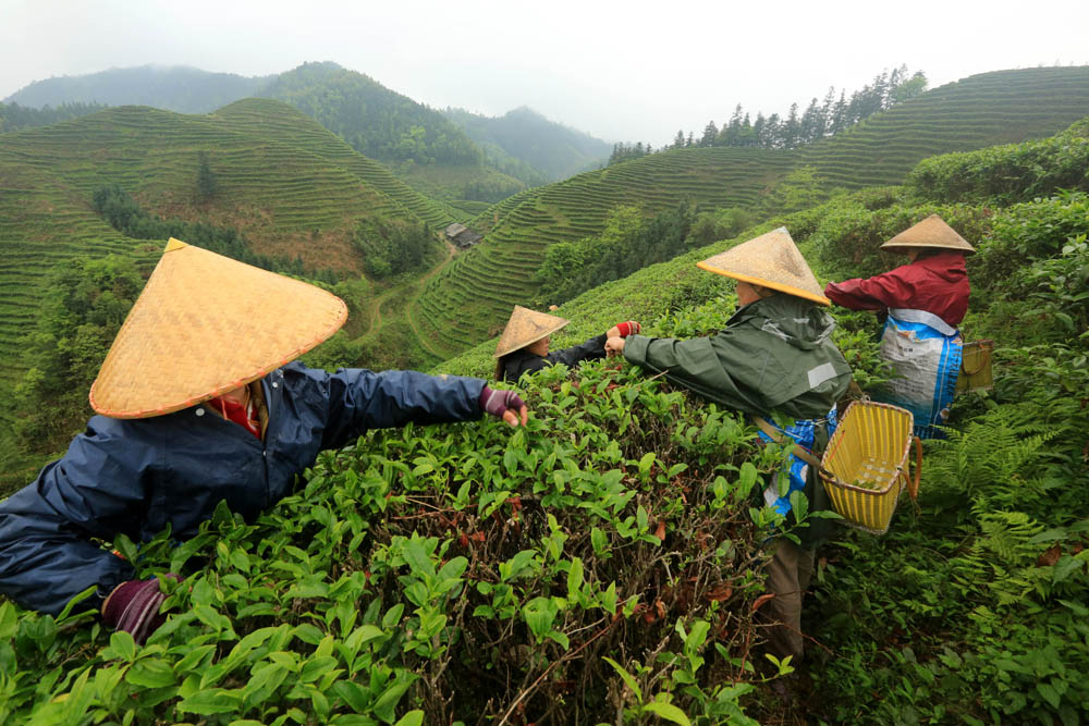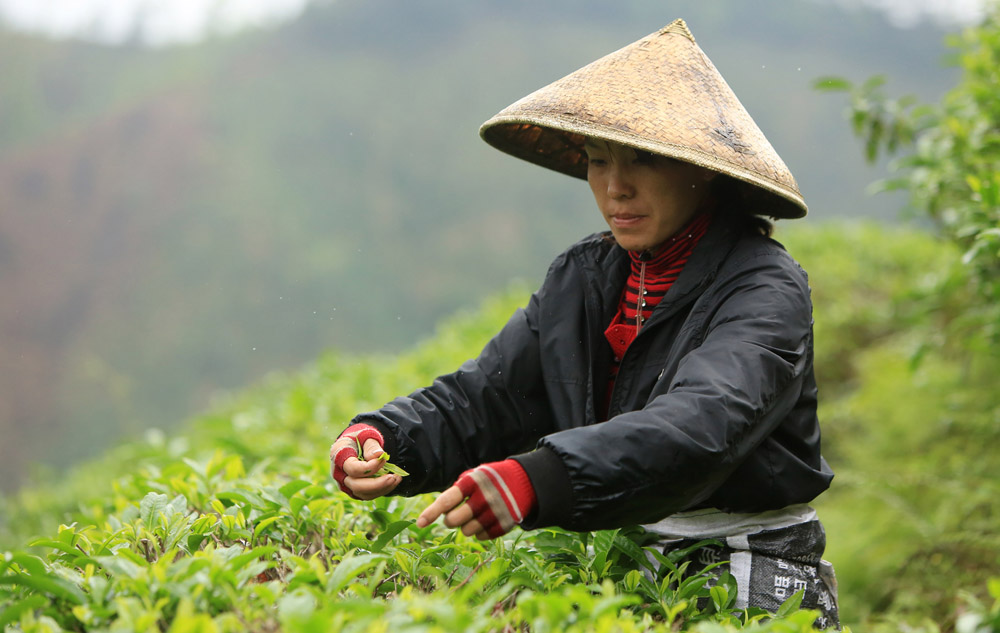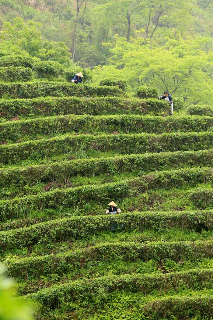 图5:4月2日,在融安县板榄镇东岭村茶园,瑶族妇女在茶山上采摘“明前茶”。