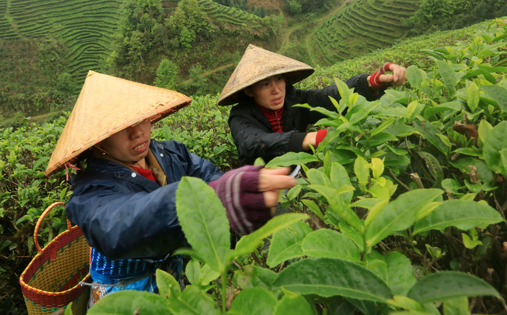 图2:4月2日,在融安县板榄镇东岭村茶园,两名瑶族妇女在采摘茶叶。