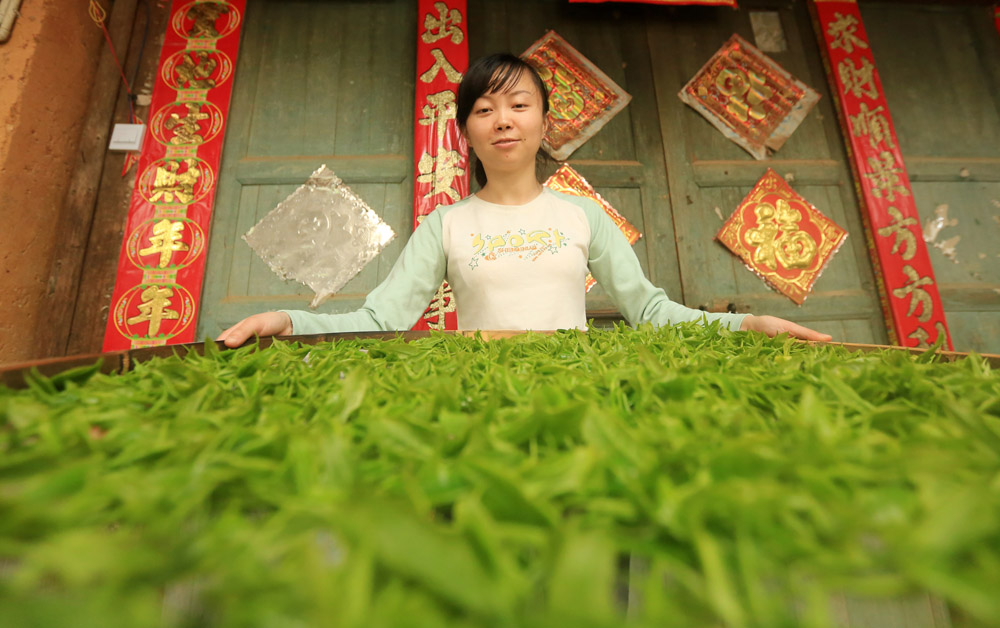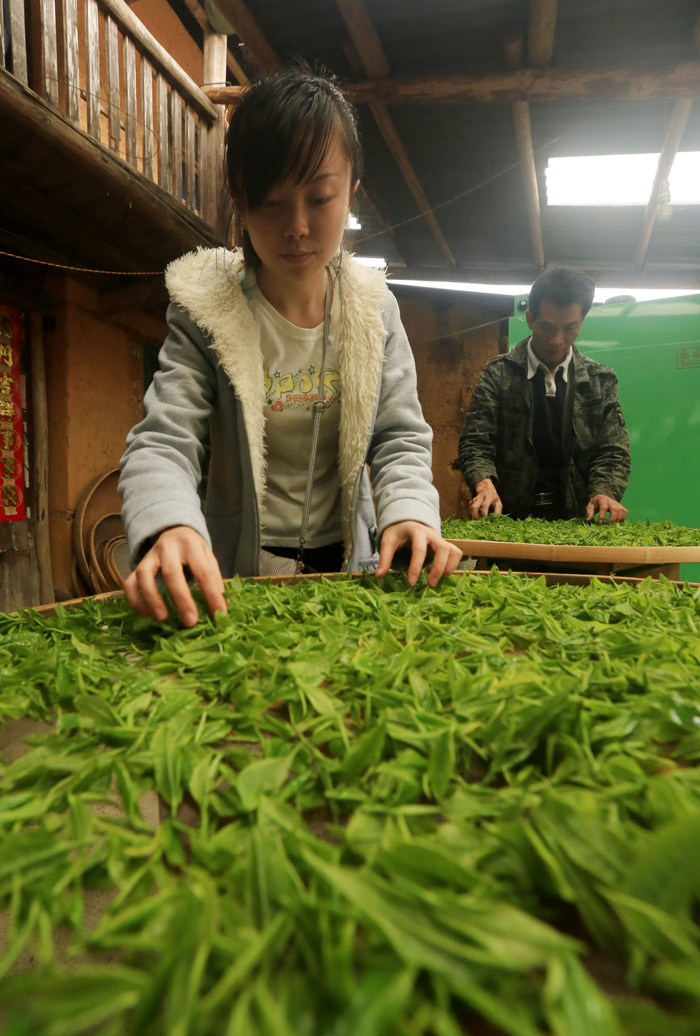 图7:4月2日,在融安县板榄镇东岭村茶园,一名茶农在晾晒刚采摘的茶叶。