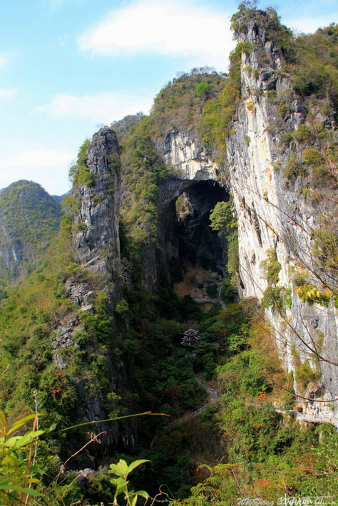 从两个溶洞中间的码头上岸,再走20米就到了中洞。如果说下洞以幽暗狭长的地下河著称,那中洞则以宽广和高大闻名。洞口有百米高,洞中有几处高大的钟乳石,其中一块好似龙爪般向下张开,洞中有一块羽毛球场大小的平地,站在上面可以看见下洞的暗河。“这上面就是当年太平天国领袖石达开屯兵的地方。”顺着胡孟金所指,山壁上一处岩洞的确堆砌了不少石块,像一道石墙,把岩洞围成一个“小屋”,而这样的小屋在洞中还有十多处。出了中洞,一股热气立刻涌上来,当我们爬至山顶时,再回望身后的中洞,却突然发现我们刚刚走过的,就是传说中的“石门”—— — 中洞出口似一道高几百米的拱门,而门的两侧各有一面平整的山壁,像石门一样敞开。