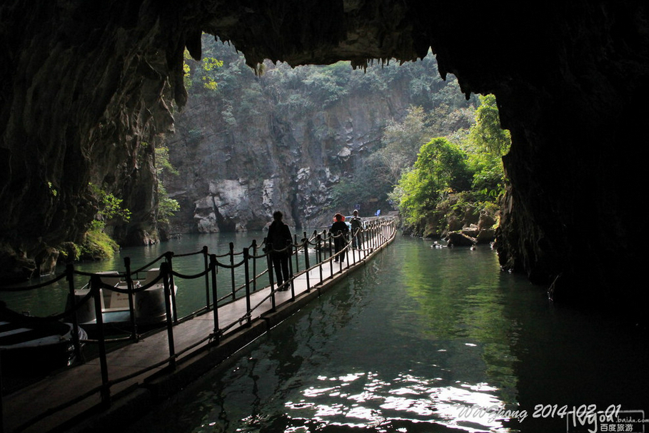“这里便是下洞,”胡孟金说,3年前,游人最远也就到达这里,再往洞口深处就看不见底,而且必须乘船才能前进。”不过现在不同了,岸边有了脚踏游船,地下暗河的溶洞石壁也装饰了靓丽的七彩灯。我们乘坐游船前行,溶洞最宽处有10多米,最窄处才3米,仅容一条游船通过。洞内的钟乳石千姿百态,前方暗不见光,似无出路,行至转角处,光线突然变亮,有两个篮球场大小的小天池出现在眼前。再往前走,又进入一个溶洞,这个溶洞比之前的还要大,最高处达百米,溶洞里不时传来蝙蝠的声音。再往前走,光线变亮,此时山壁上的摩崖石刻清晰可见,据介绍,石门洞里共有清咸丰、同治年间的碑文3000多字。出了洞口就出了石门景区,来到石门水库,由于目前景区外尚未有码头停靠,因此我们只好返回。