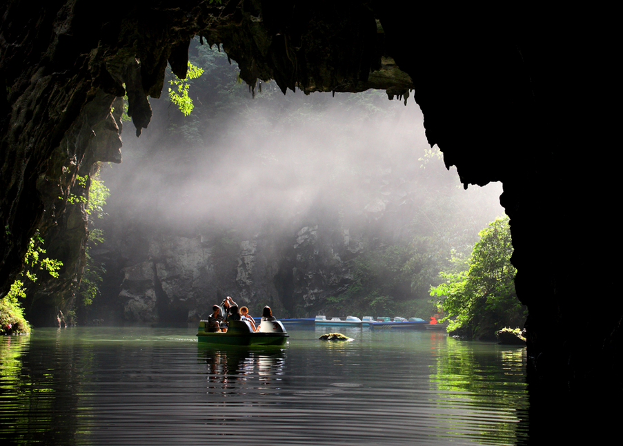 庄子曾说:天地有大美而不言。行走在石门村的仙湖景区,记者就感受了一番不可言喻的自然之美。石门景区位于大良镇境内,距融安县城52公里,从大良镇驱车经过5公里的村级路即可直达景区,交通十分便利。景区最神奇的莫过于它的3个岩洞,每个岩洞景色各不相同,却又彼此相通:下洞暗河涌动,幽深狭长,水能行舟,洞中明亮处可见水雾升腾,阴暗处则有蝙蝠出没,似梦中仙境,又似神秘天险;中洞宽敞明亮,能容数百人,洞口直通云天,洞中既有奇幻钟乳石,又有清代摩崖石刻;上洞藏于山峰顶端,需穿过幽长暗道方能抵达,入洞之后别有洞天,洞内平坦似厅堂,洞口直通天际,洞下瀑布倾斜而出,相传太平天国“翼王”石达开曾行军至此,在洞中议事。