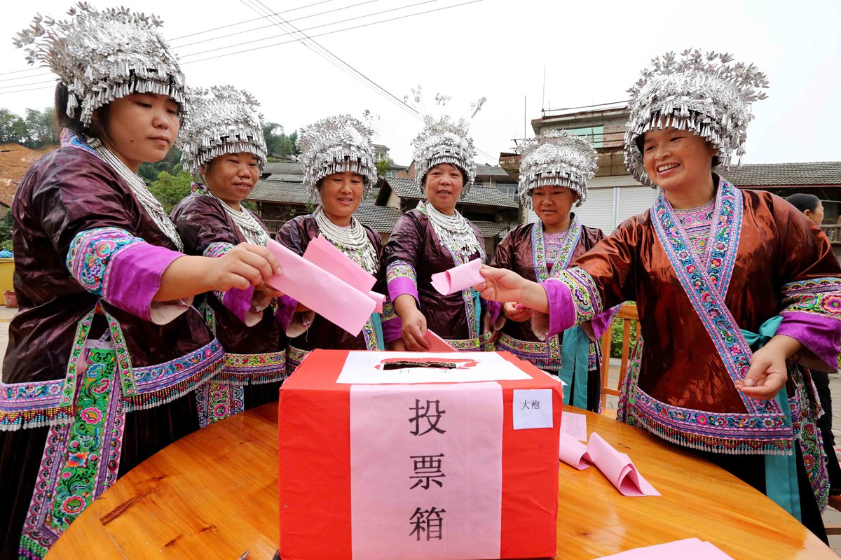 图1:8月29日,在融安县安宁村大袍屯,苗族妇女在投选票。(谭凯兴 摄)