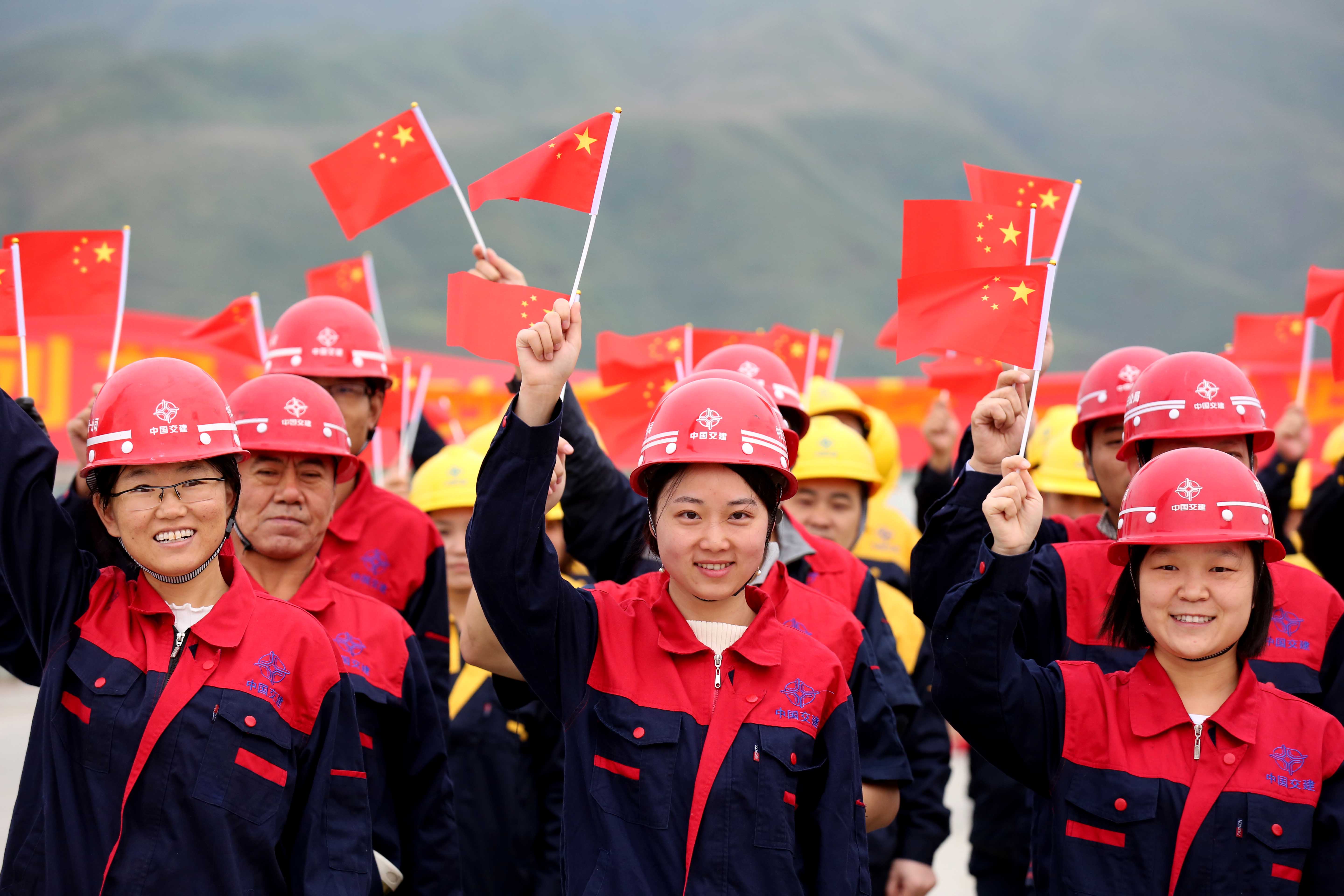 图1:10月18日,在三柳高速公路融安融江大桥竣工通车仪式现场,工程建设者挥动国旗庆祝通车。(谭凯兴 摄)