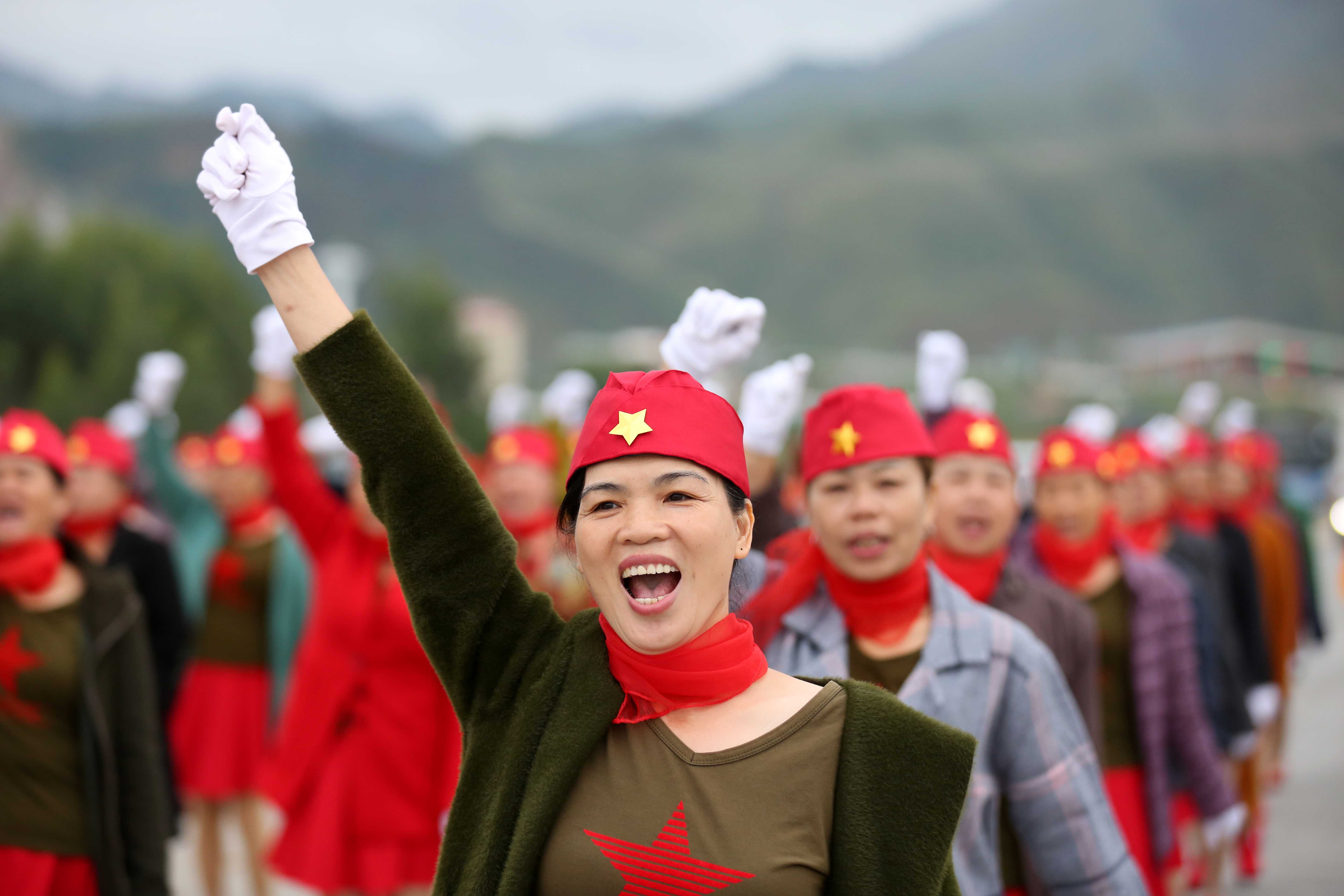 图5:10月18日,在三柳高速公路融安融江大桥竣工通车仪式现场,一名身着水兵服的妇女在表演舞蹈。(谭凯兴 摄)