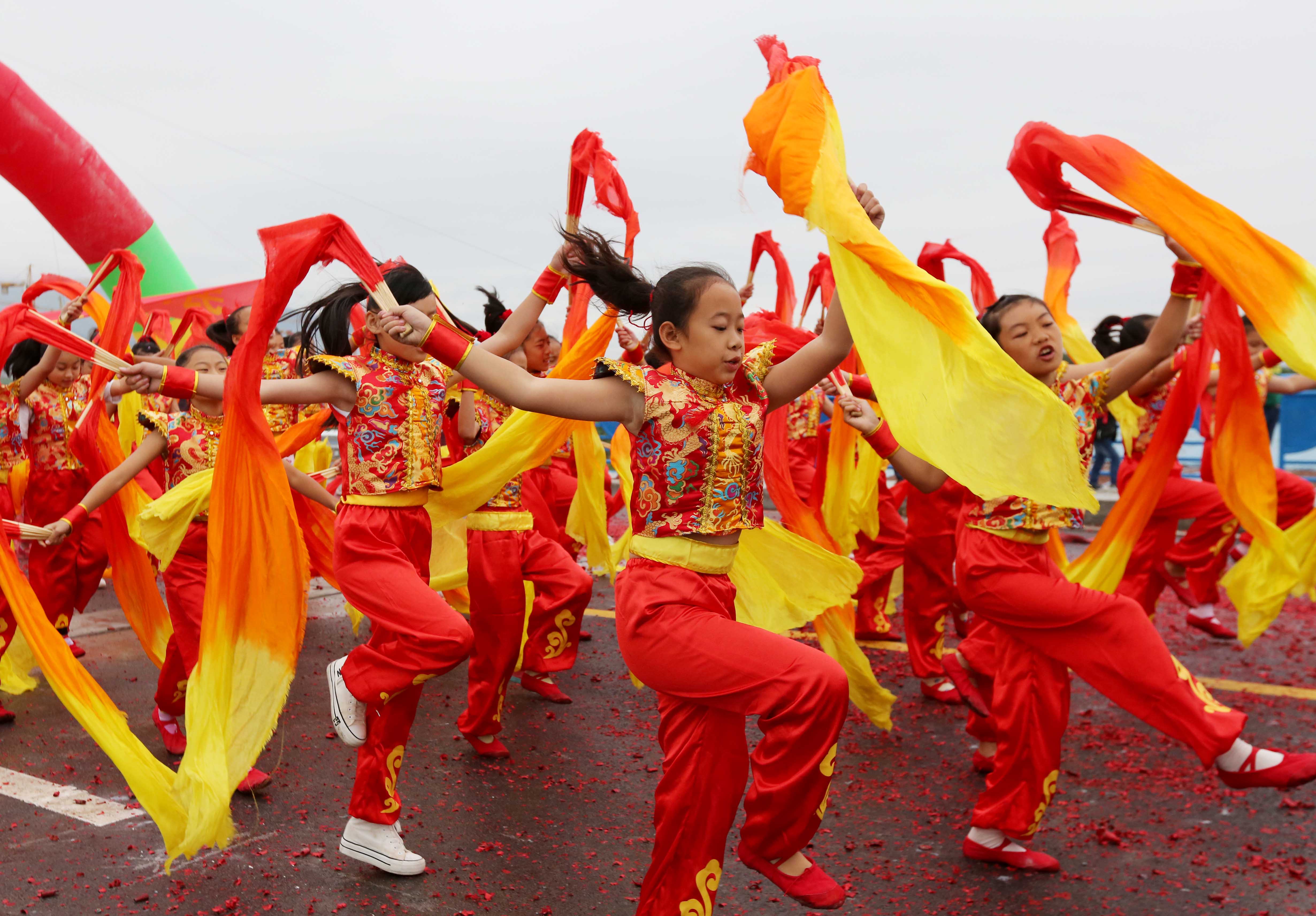 图6:10月18日,在三柳高速公路融安融江大桥竣工通车仪式现场,一名学生在表演舞蹈。(谭凯兴 摄)