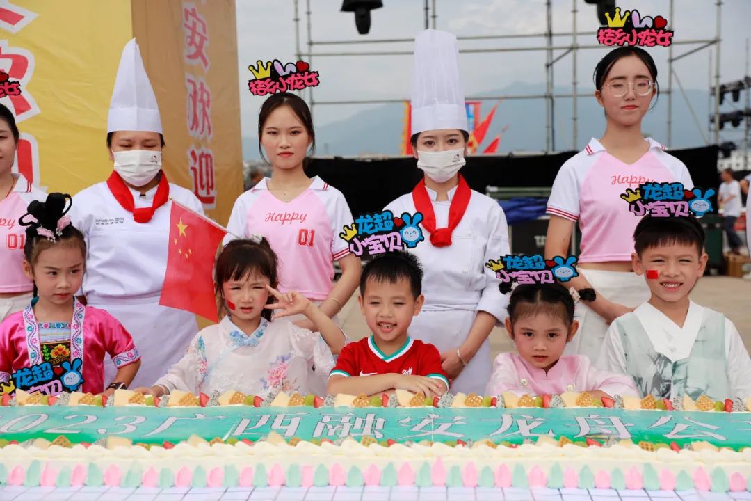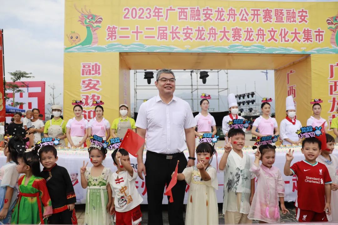 9月28日,在融安县龙舟文化大集市上,县长于福坚(前中)和龙超宝贝一同分享蛋糕并合影。(罗洁芳 摄)