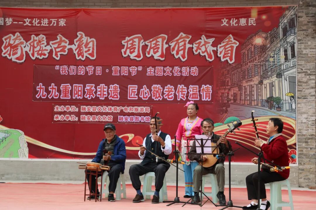 10月25日,融安县在彩调广场成功举办以“九九重阳承非遗 匠心敬老传温情”为主题的重阳节活动。活动将传统重阳节庆与本土非物质文化遗产相结合,为老年群体提供了丰富的文化体验与暖心服务,实现了非遗传承与为老服务的有机融合。