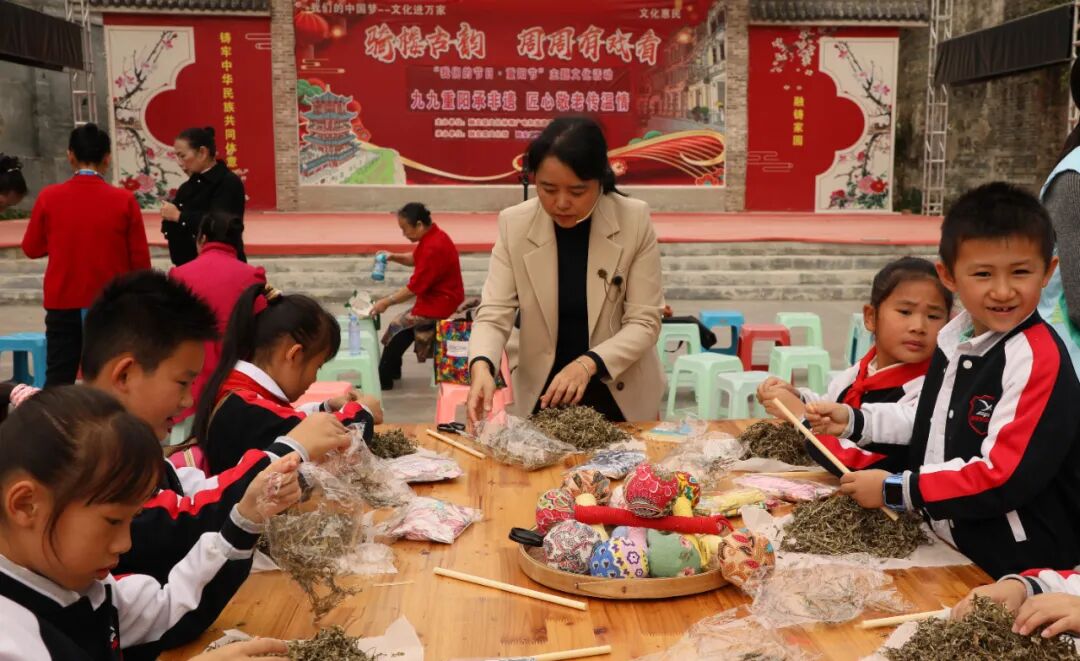 活动现场设置了丰富的体验与服务项目,艾草锤制作区内,孩子们在老师指导与西部计划志愿者协助下学习制作,非遗美食制作体验区吸引众多老人参与,现场还同步开展美食品尝、图书阅览与免费义诊等服务,为节日增添温情。非遗展演环节则荟萃地方特色,区级传承人雷玉群、陈丽雯与县级传承人黄爱萍分别带来山歌《劝世文》、文场《人民解放军占领南京》、彩调《十二月花》等经典曲目,精彩接连登场。