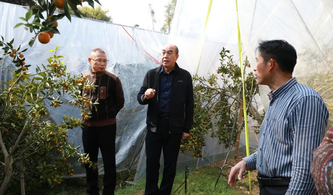 在大将镇富乐村韦成兴的果园,陈宏实地察看融安金桔提质增效栽培示范基地——融安金桔新品种新技术孵化基地,详细了解金桔生长挂果、种植规模、品种改良及产销对接等情况,并就金桔产业高质量发展与品牌建设工作提出了具体指导意见。
