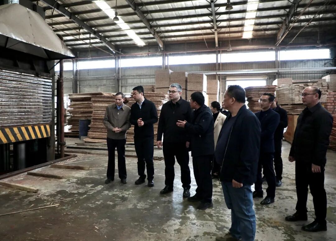 3月25日,县委书记于福坚(前左三)到广西融安县忠华木业有限公司调研。(方淑敏 摄)
