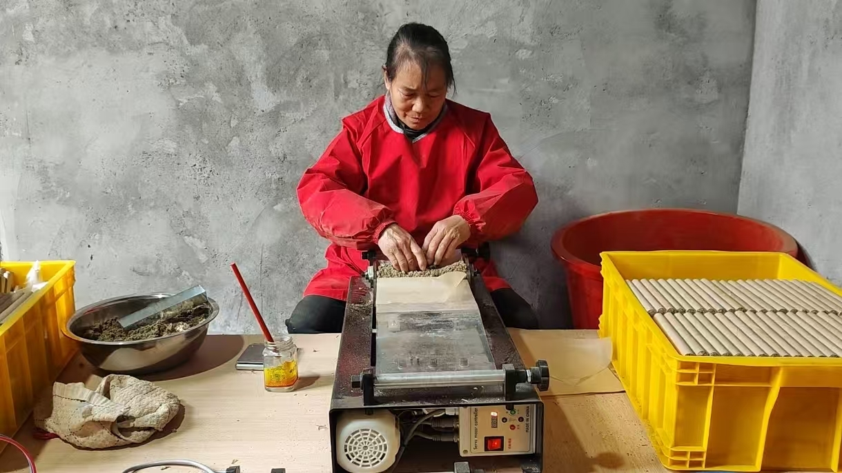 引进的草珊瑚艾条项目采用“集中加工+分散代工”的生产模式,在镇内设立代加工点,同时将艾条卷制、包装等工序下沉至村屯。通过统一培训、统一供料、统一质检,村民可在家或村内代工点灵活参与生产。艾条制作项目的落地,能极大带动本地就业,村民在家门口就能实现就业增收。