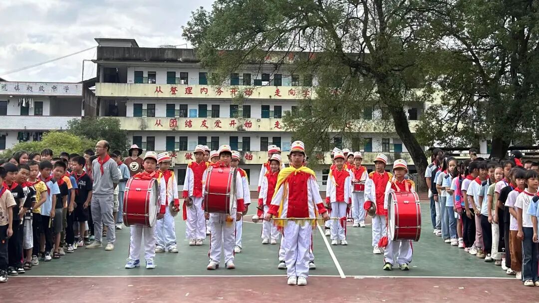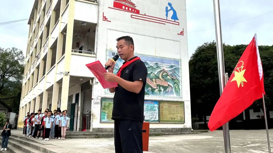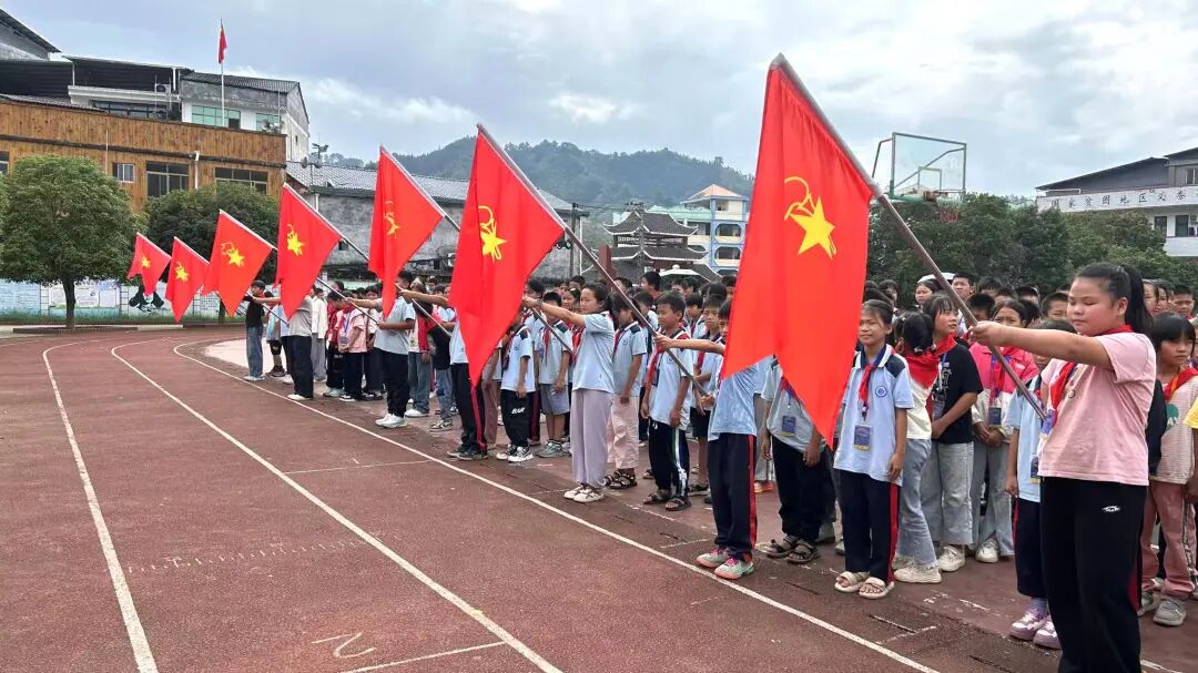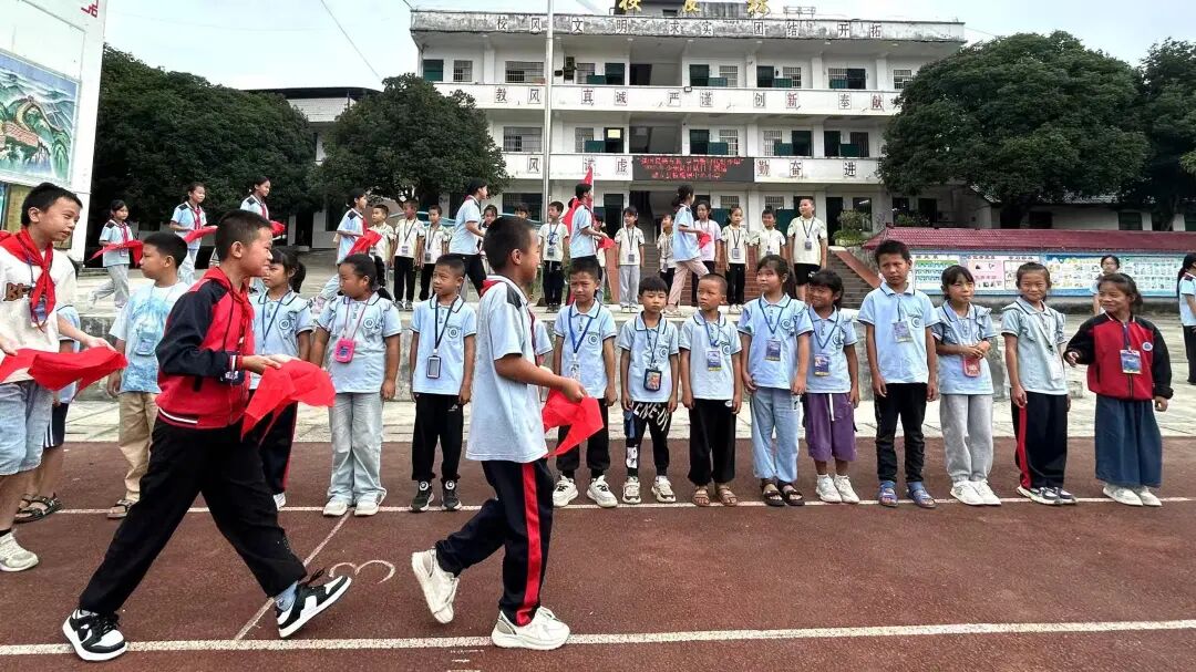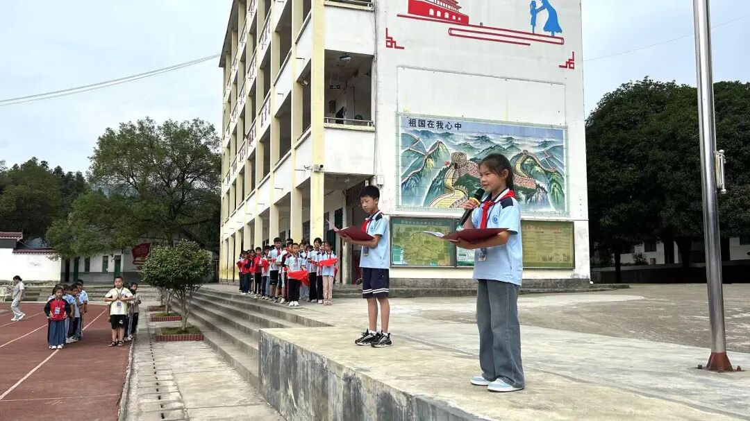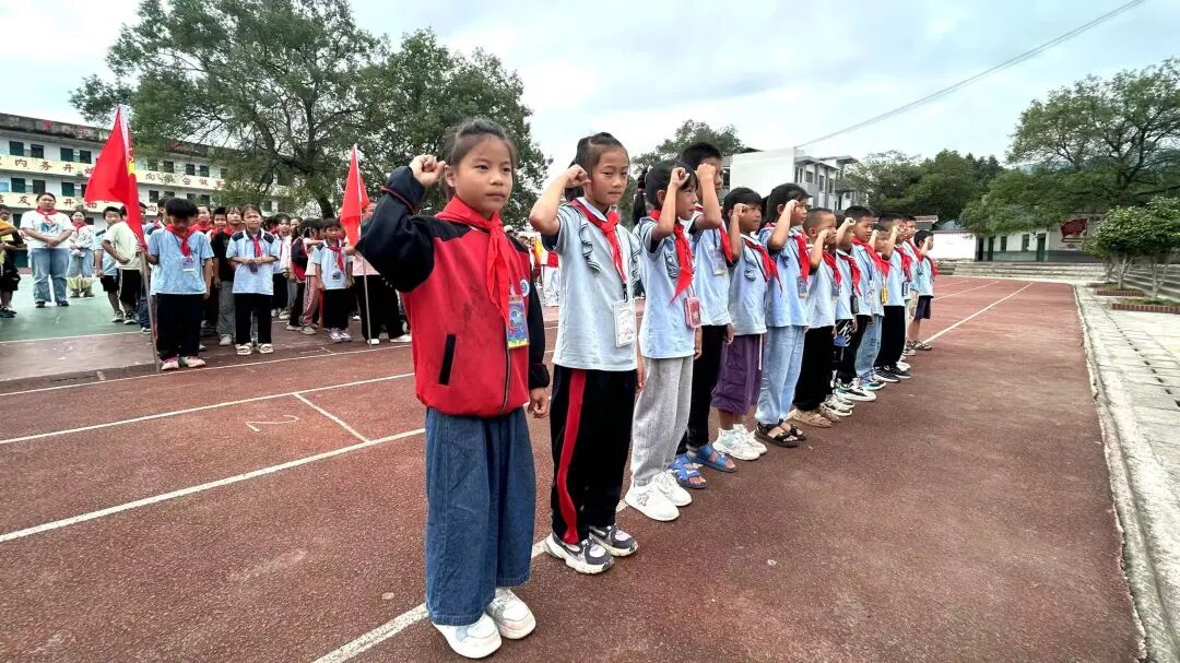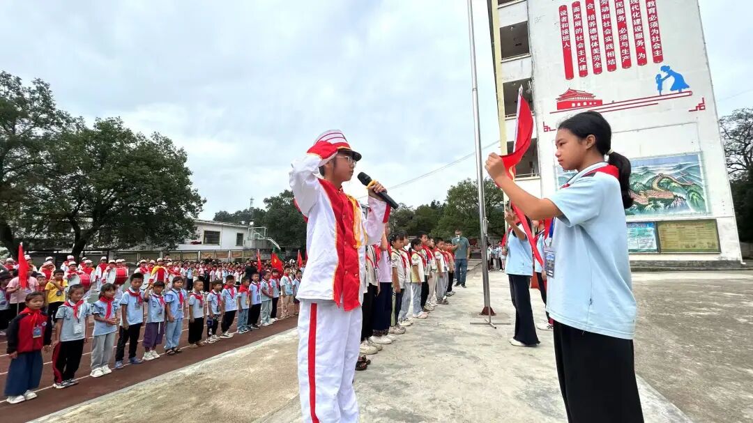 大队辅导员宣读新队员名单后,低年级少先队员温习队礼,高年级队员在《红领巾飘起来》的音乐中,有序为新队员佩戴红领巾——老队员双手托红领巾敬队礼,授予新队员后细心系好,双方互敬队礼后老队员归位。接着,全体队员举右拳向队旗宣誓;韦依灵同学以《争做新时代好队员》为题宣讲,传递责任与担当;韦成学校长讲话,激励队员们听党话、爱祖国,立志成长为社会主义合格人才、共产主义事业接班人。
