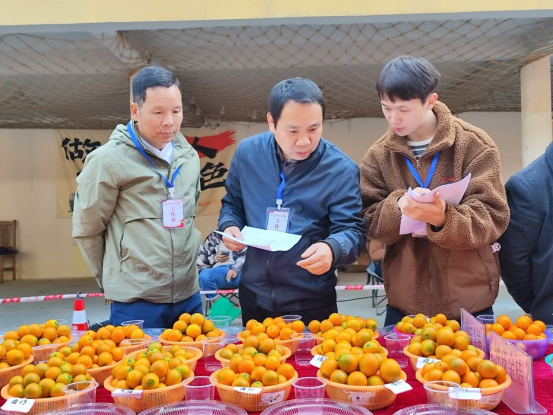 工作人员对参赛的脆蜜金桔打分。