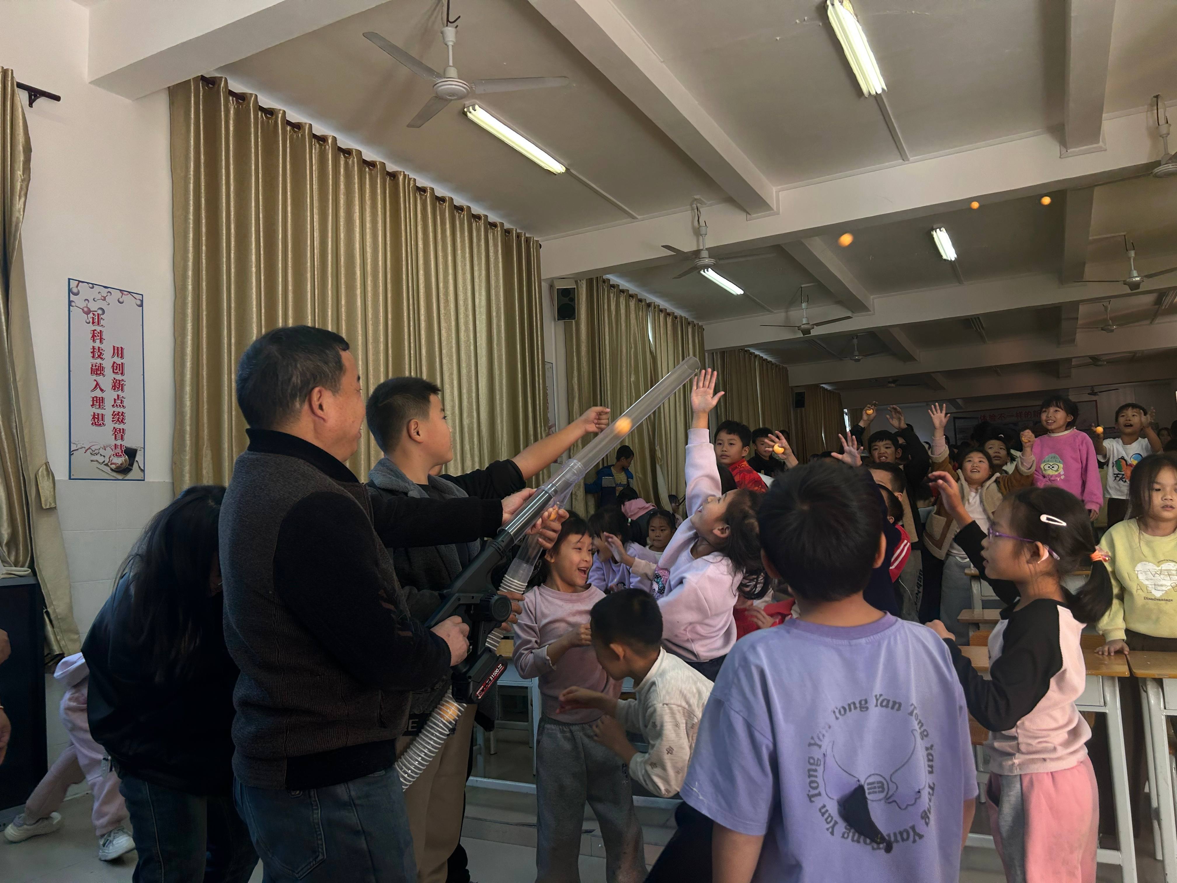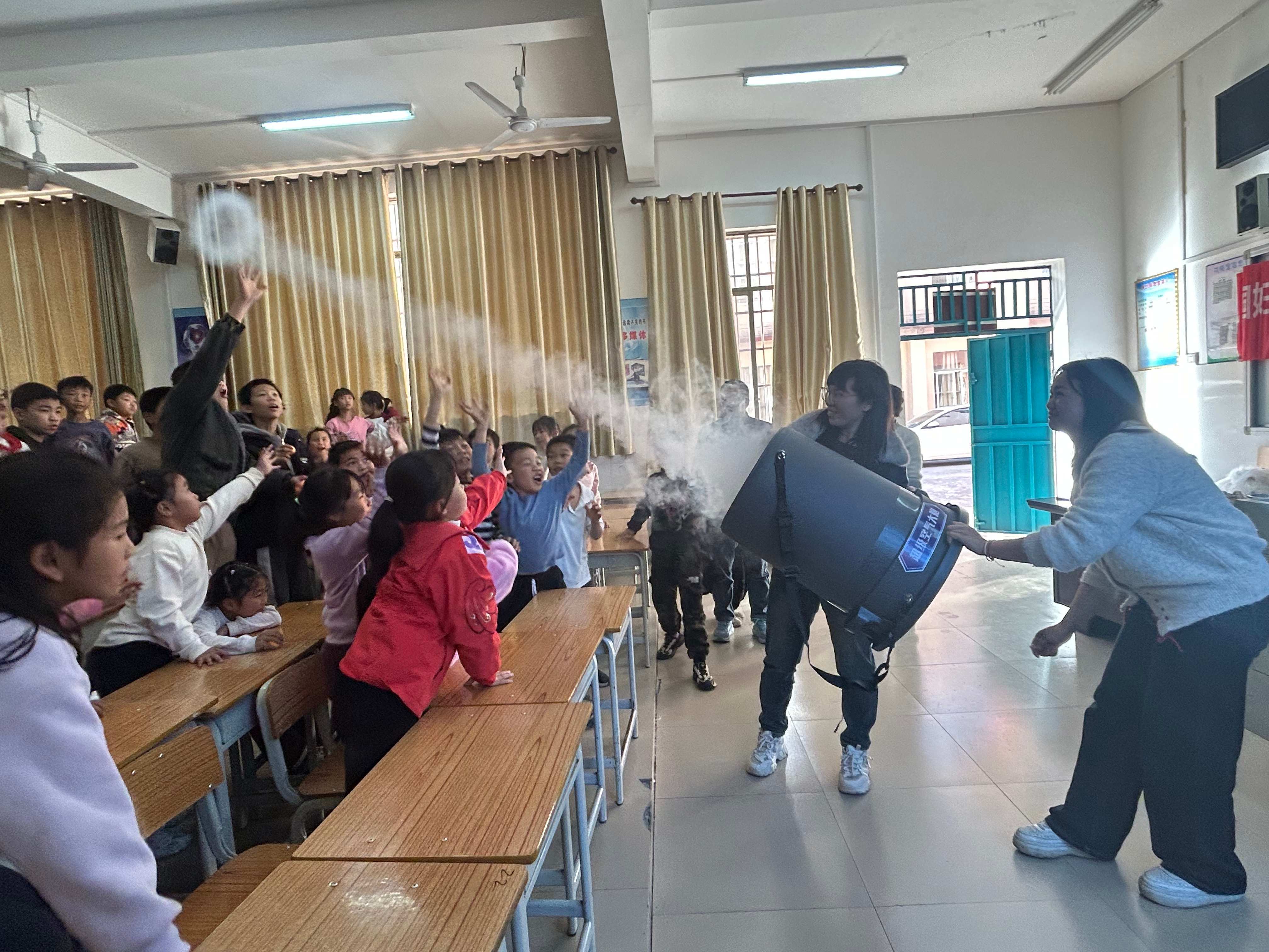 午后时分,学校的多媒体教室变身为一个充满奥秘的“临时实验室”。空气炮、静电发生器等实验器材整齐摆放,老师和志愿者们带领同学们展开一场场奇妙的科学探索:静电让彩色纸片“绽放”如花,火焰在掌心跃动却不灼皮肤,按下空气炮的开关,烟雾圈划出优美的弧线;调整机关炮角度,乒乓球精准击中目标……这些看似简单的装置背后,蕴藏着物理与化学的奇妙原理,引得围观学生眼中闪烁着好奇与惊喜的光芒。