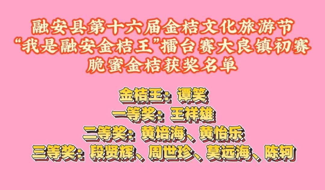 12月1日,融安县第十六届金桔文化旅游节“我是融安金桔王”擂台赛大良镇初赛获奖名单。