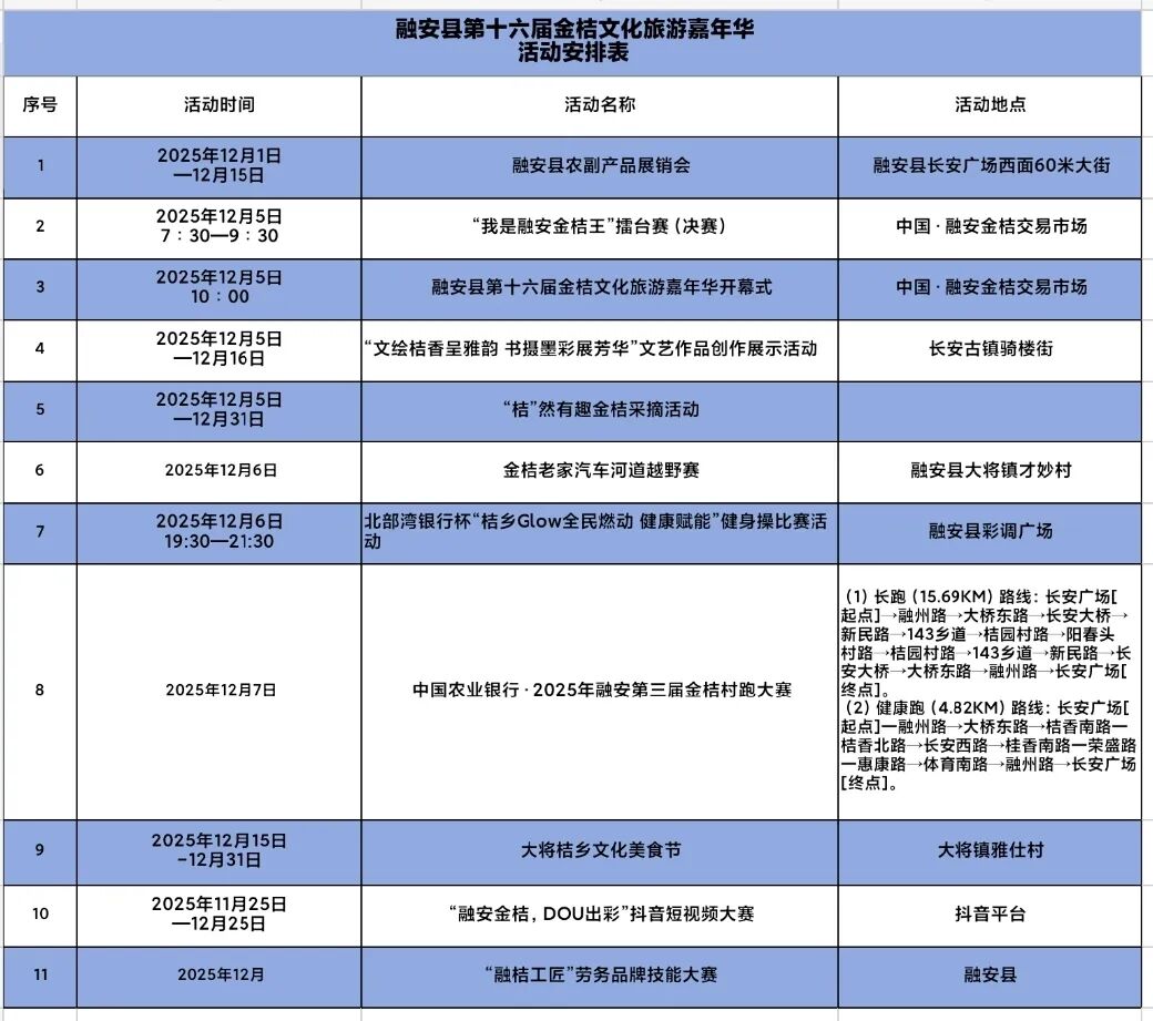 十二月,北国已是银装素裹、寒意渐浓,桂北融安却暖意融融,漫山金桔缀满枝头,迎来一年中最甘甜的丰收时节。这座被誉为“中国金桔之乡”的小城,将于2025年12月5日盛大启幕第十六届金桔文化旅游嘉年华。活动期间,多项特色子活动将同步登场,融安以满腔热忱与累累硕果为媒,诚邀八方宾朋共赴这场甜蜜盛会,共品丰收的喜悦。