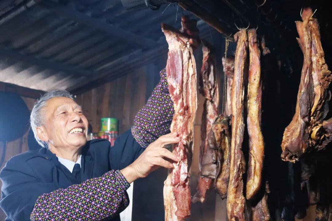 望着满满当当的腊味,余大爷笑得合不拢嘴:“以前做腊肉,就挑块五花肉,够过年尝尝鲜就行。这两年不一样了,家里种了金桔,收入一年比一年稳,手头宽裕了,就想着多做些花样,让孩子们回来吃得尽兴!”灶膛里,香杉枝与桔皮的香气缓缓升腾,和肉香交织在一起,飘出灶房,也飘出了余大爷心中的满满幸福感。
