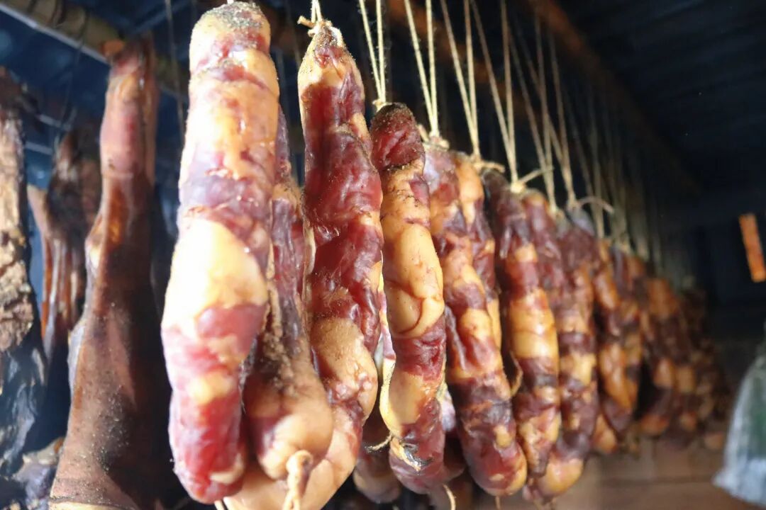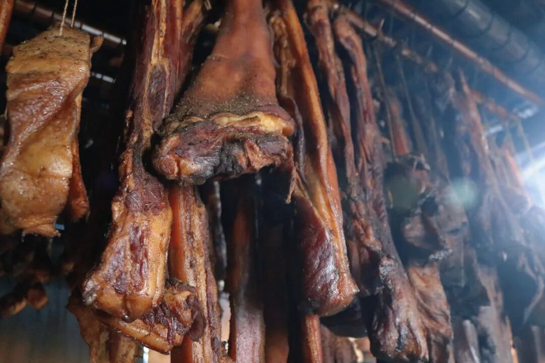 天刚蒙蒙亮,板榄镇拉谢村的余大爷就提着竹篮赶往集市,精挑细选回最新鲜的猪肉、猪蹄。回家后,按照家传的秘方,将切好的肉条均匀抹上酱料,层层码进桶内,静待两日的腌渍入味,再将腌好的肉穿绳悬挂在灶房火坑上方,与猪头皮、香肠等一同接受烟火的熏烤。
