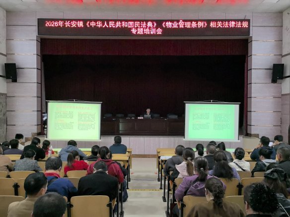 为深入贯彻落实中国共产党长安镇第十八届代表大会第七次会议精神,全面提升社区服务与管理水平,规范居民小区治理秩序,强化相关从业人员法律素养,切实防范化解小区治理中的法律风险,3月27日,长安镇召开2026年居民小区规范化管理推进会暨《中华人民共和国民法典》《物业管理条例》相关法律法规专题培训会,同步通报2025年度各小区业主委员会、物业管理委员会年度考核结果。镇党委副书记、镇长李海学,镇人大主席曹人良,镇相关职能部门工作人员出席会议。各社区“两委”干部,全镇各居民小区物业公司管理人员、业主委员会、物业管理委员会代表参加会议,共同为长安镇小区规范化管理高质量发展凝心聚力、谋篇布局。