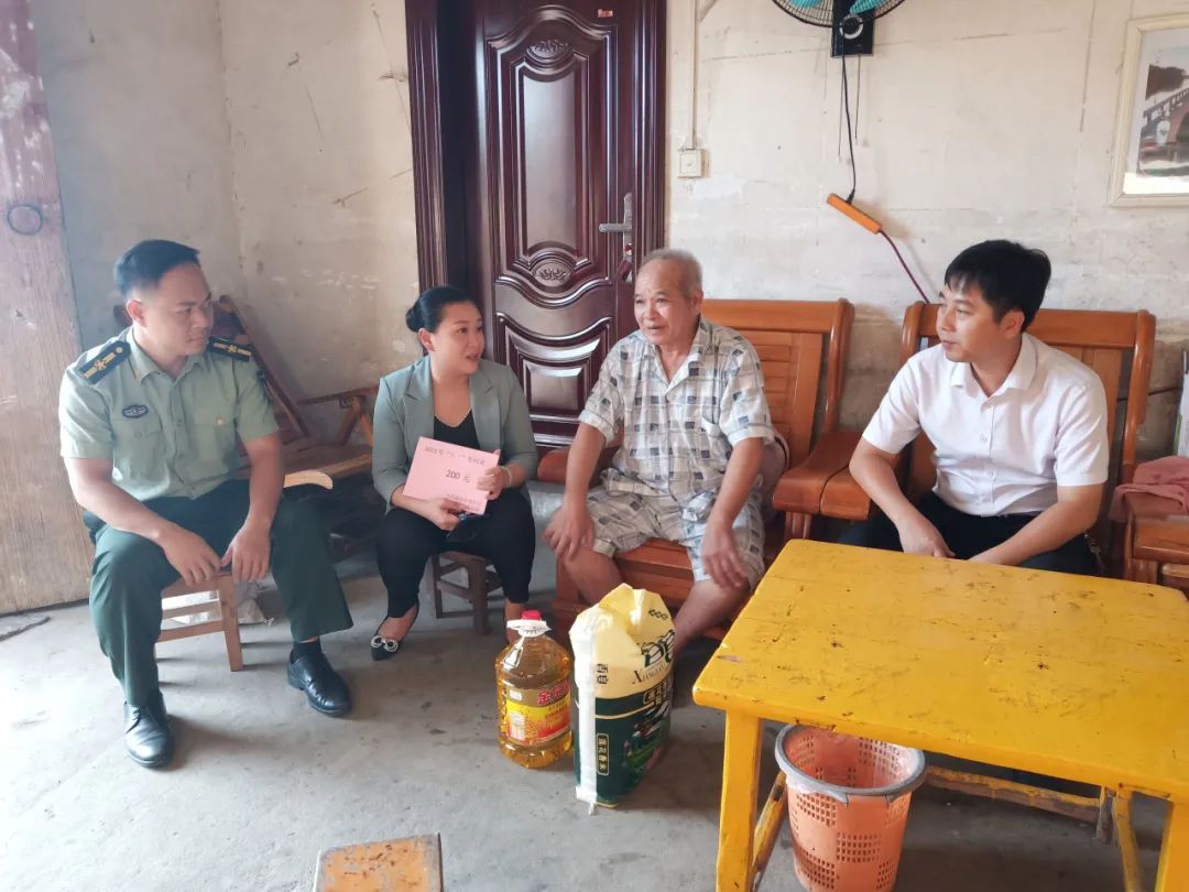 7月31日,在大良镇古兰村,大良镇党委书记江昕颐(左二),党委副书记、镇长韦昊(右一)在慰问退役军人。
