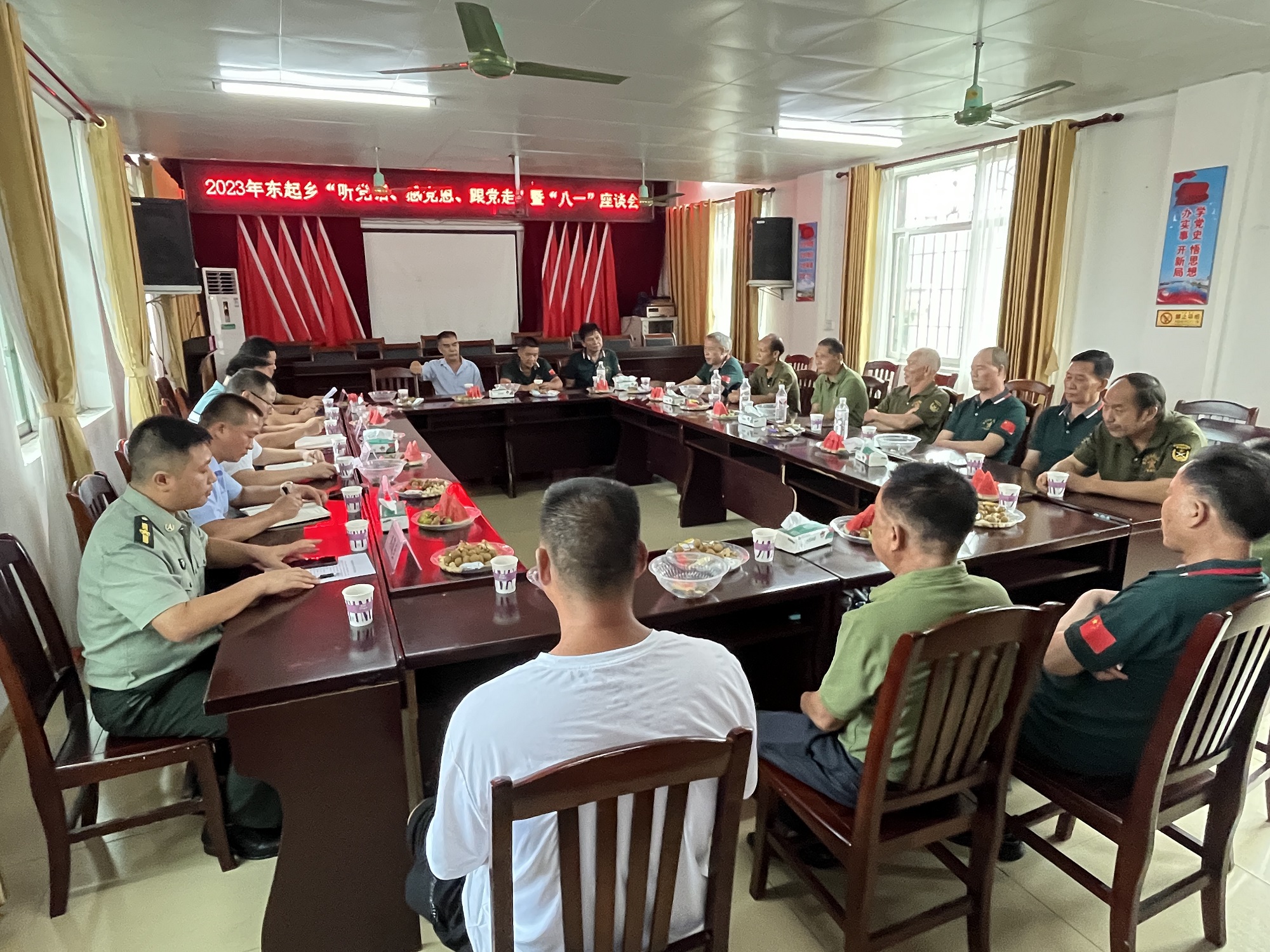 为庆祝中国人民解放军建军96周年,继承和弘扬爱国拥军光荣传统,8月1日上午,东起乡人民政府开展2023年“弘扬军人精神 致敬英雄军人” “八一”参战老兵、退役士兵代表座谈会活动。乡党委书记谭世波、人大主席韦启杨、副书记周胜、武装部部长韦灏垒及19名退役军人代表参加本次活动。